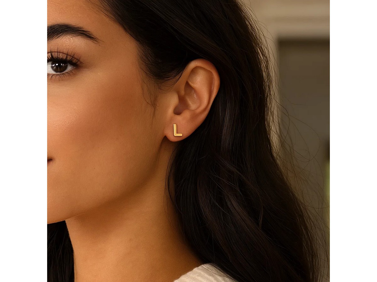 Elegant 14K yellow gold “Yours Truly” Initial L stud earring featuring a polished finish and refined minimalist design. This personalized piece adds a touch of timeless sophistication perfect for daily wear or as a meaningful, thoughtful gift.