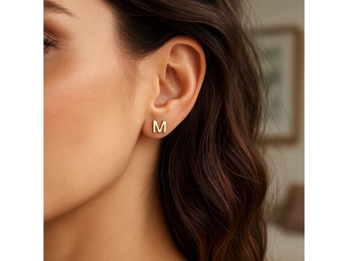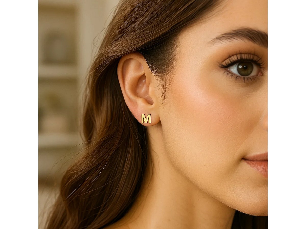 Chic 14K yellow gold “Yours Truly” Initial M stud earrings featuring a sleek polished finish and minimalist design. These personalized studs offer timeless elegance and individuality, perfect for everyday wear or as a thoughtful and meaningful gift.