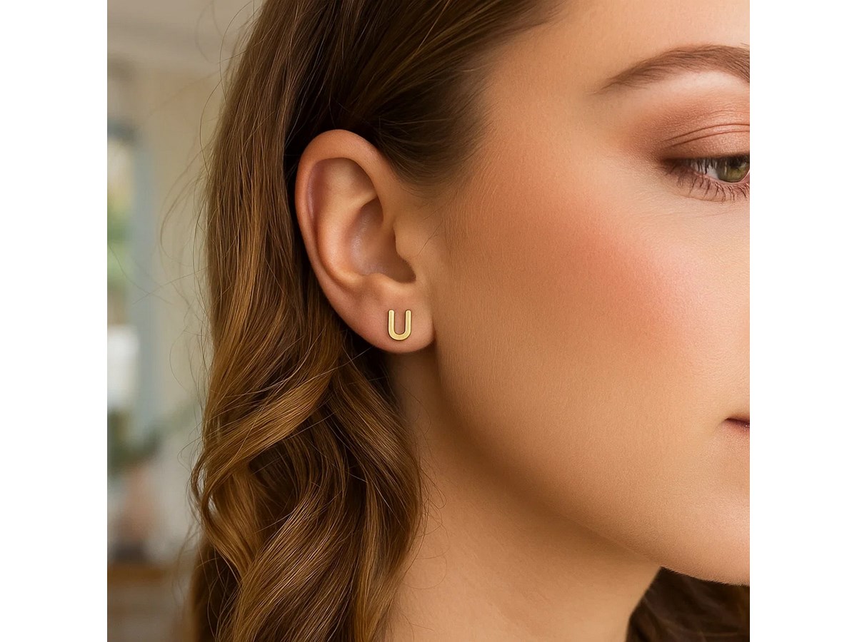 Chic 14K yellow gold “Yours Truly” Initial U stud earrings featuring a polished finish and minimalist design. These personalized earrings embody timeless elegance and individuality, perfect for everyday wear or as a meaningful, stylish gift.