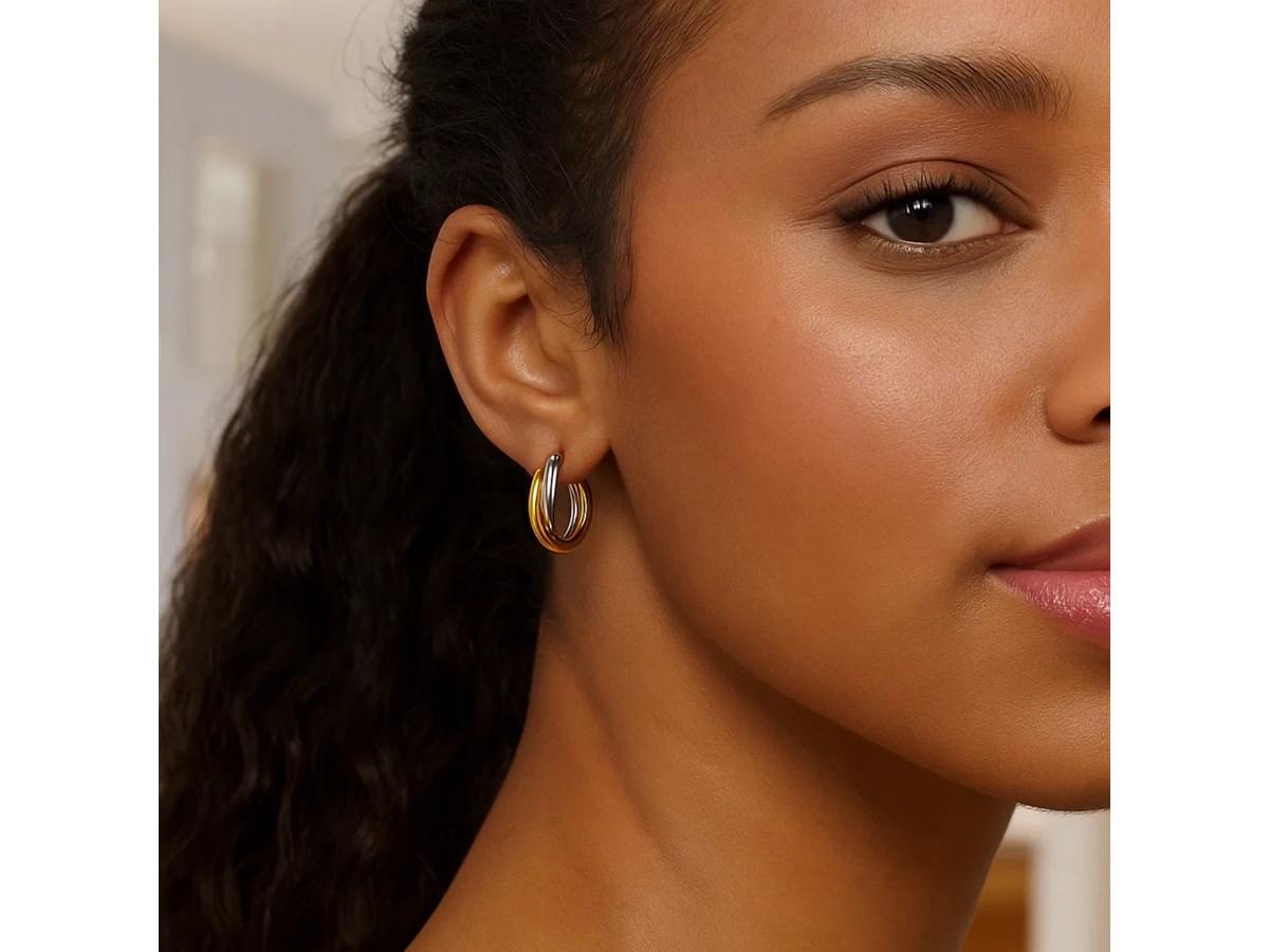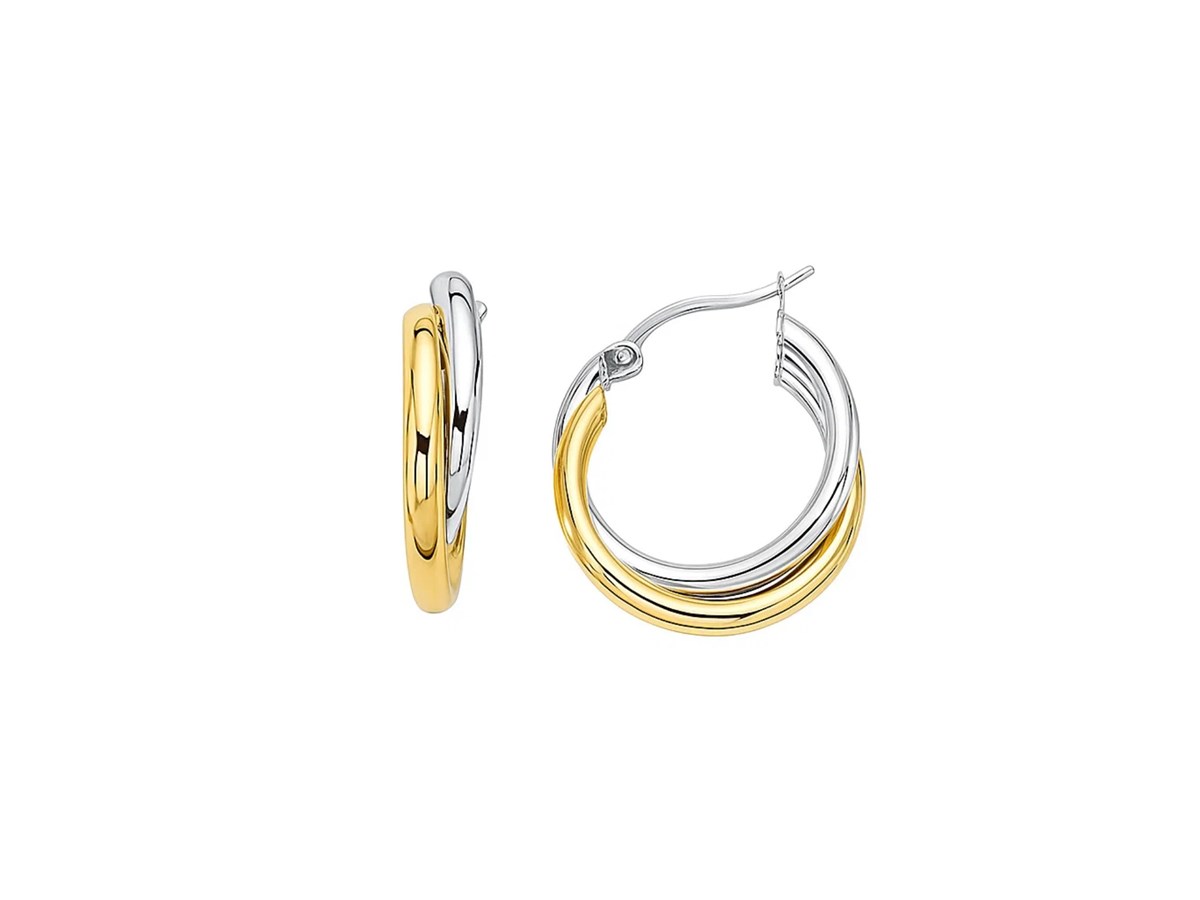Elegant 14K two-tone gold double row hoop earrings featuring intertwined yellow and white gold bands with a polished finish. The dual-tone design adds depth and sophistication, creating a timeless look perfect for everyday wear or special occasions.