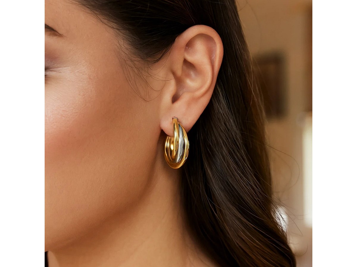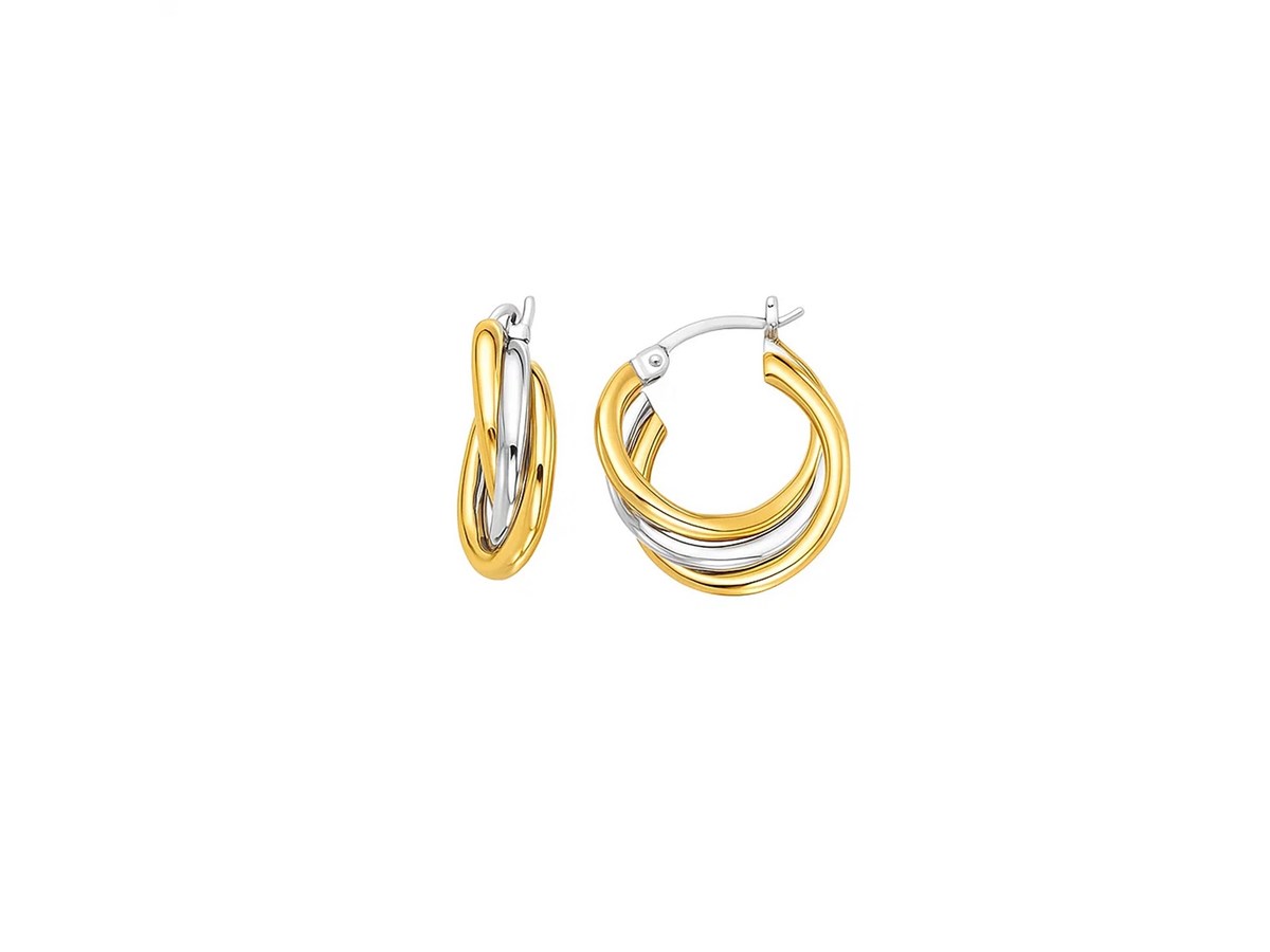 Elegant 14K two-tone gold triple row hoop earrings featuring a polished finish and contrasting yellow and white gold bands. The layered design adds depth and sophistication, creating a radiant statement piece perfect for both everyday elegance and special occasions.