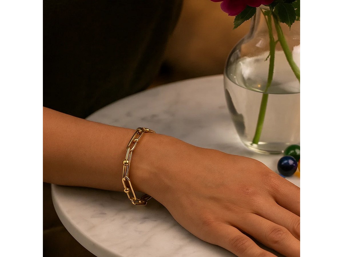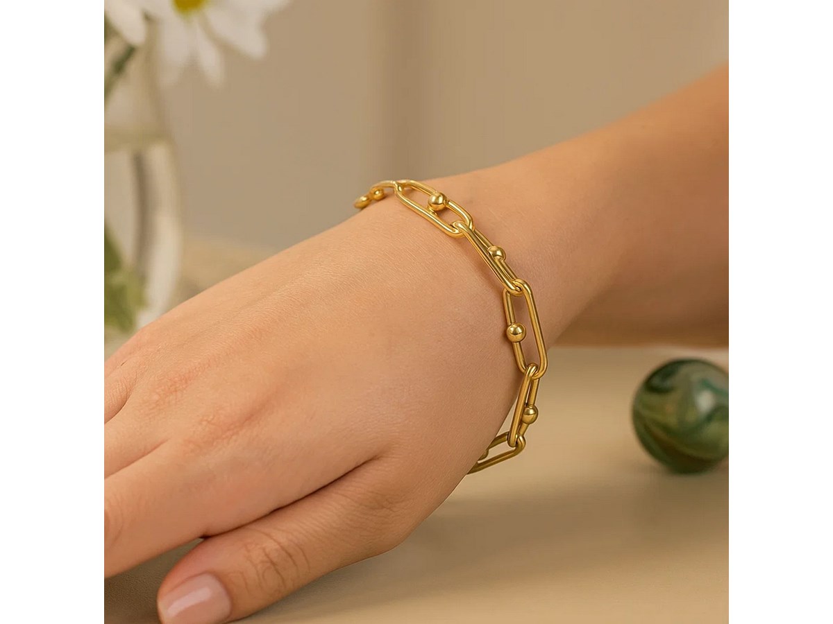 Stunning long oval links of breathtaking 14k yellow gold are embellished with shiny gold beads on this uniquely bold bracelet. Bracelet is 7 3/4 inches long.