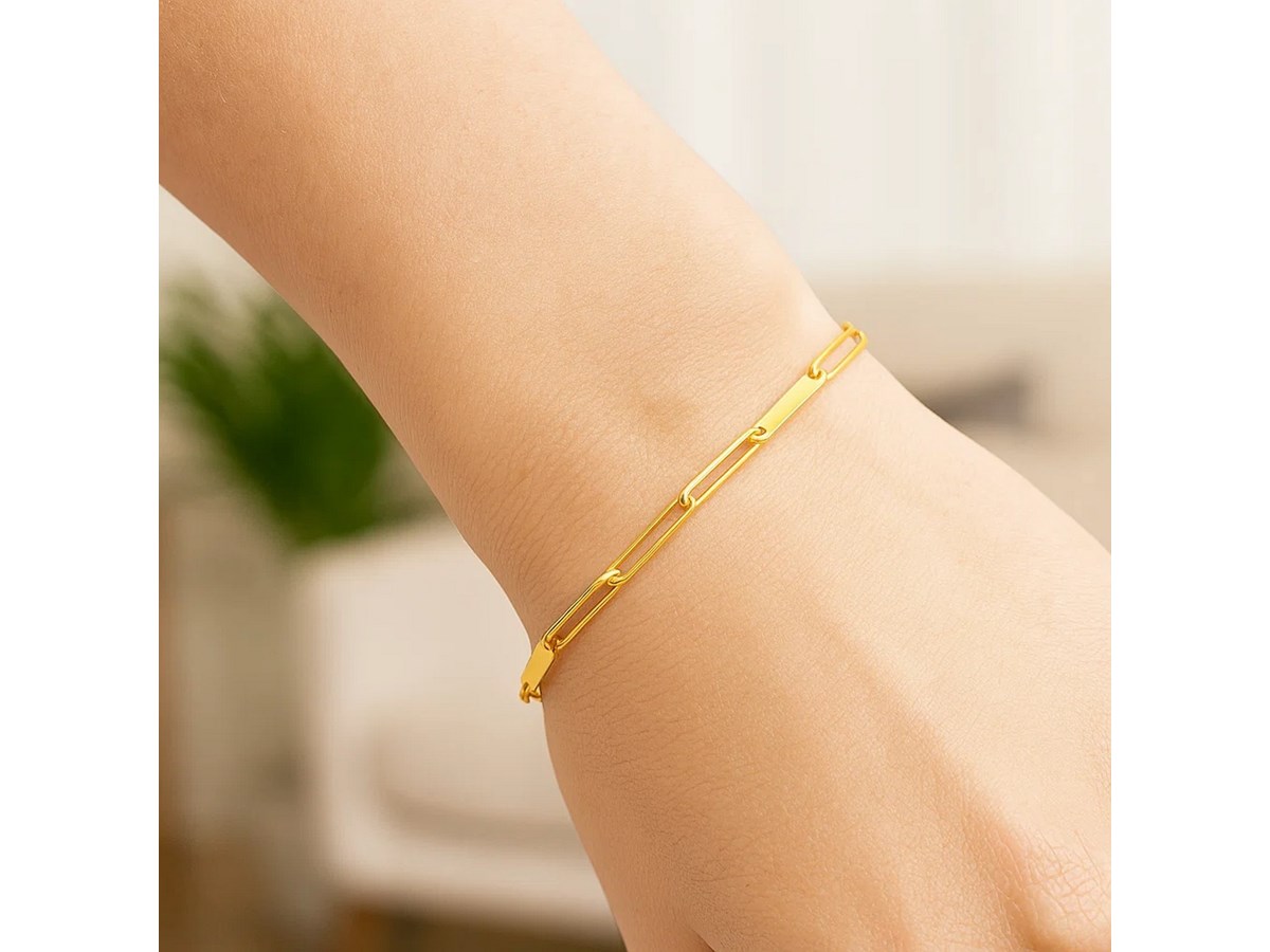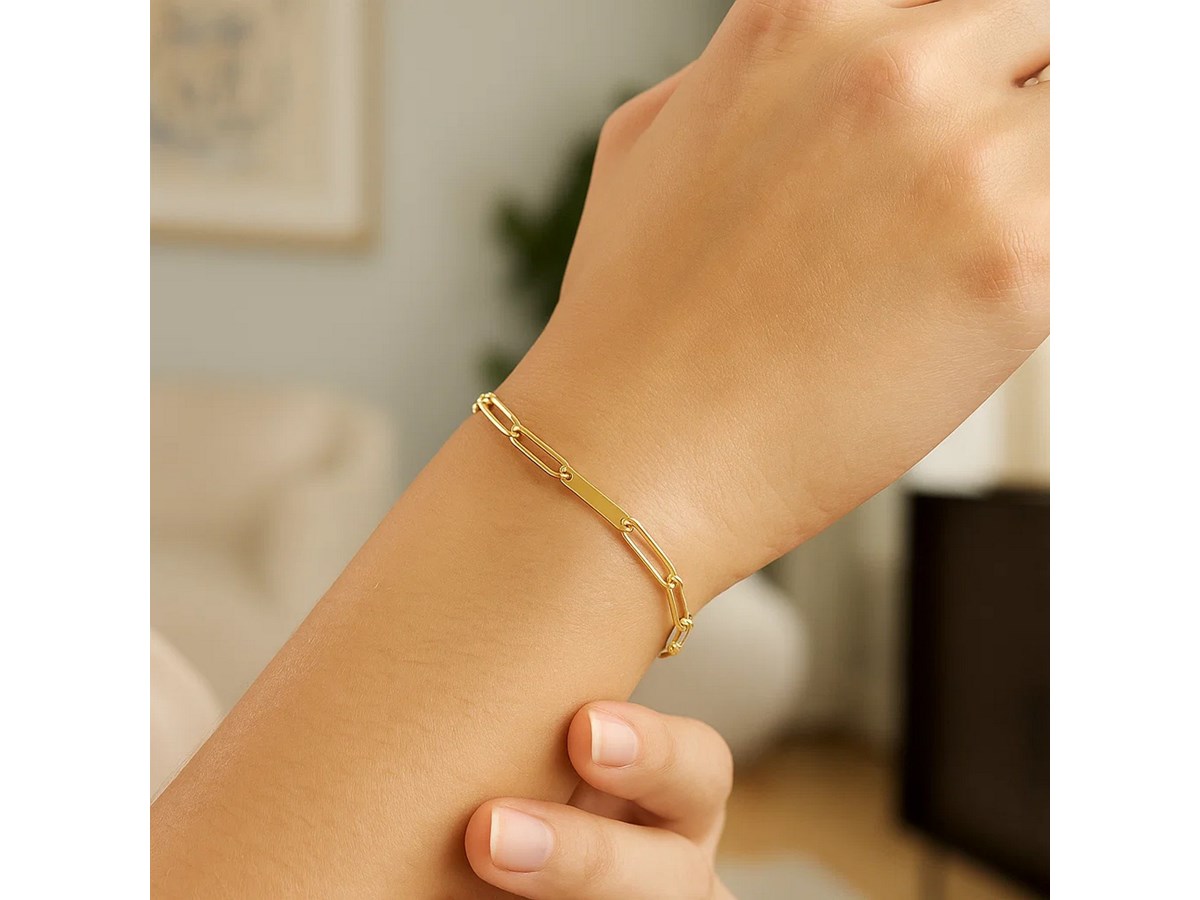 Exquisite links of gleaming paperclip chain meet radiant gold bars on this timeless yet modern 14k yellow gold bracelet. Bracelet is 7 inches long and closes with a lobster clasp.