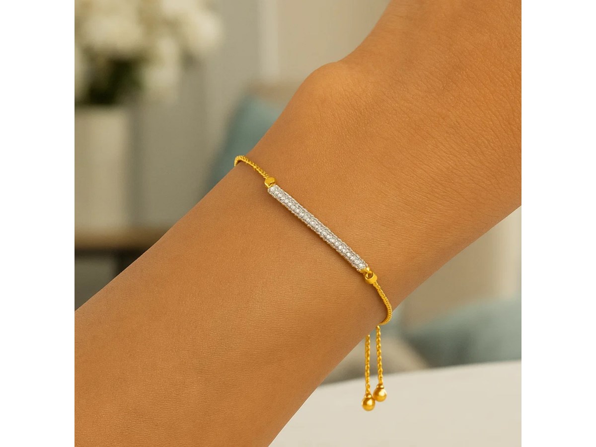 A sparkling row of elegant diamonds is the highlight of this elegant friendship bracelet in 14k yellow gold. Bracelet is 9 1/4 inches long and adjusts with a draw string clasp.