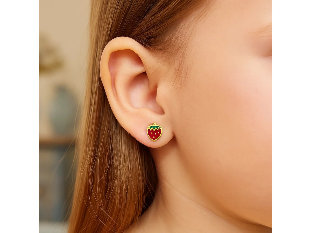 She will rejoice with the deliciousness of summer fruit when she wears these unique 14k yellow gold and enamel strawberry earrings. childrens earrings are held in place by screw clasps.