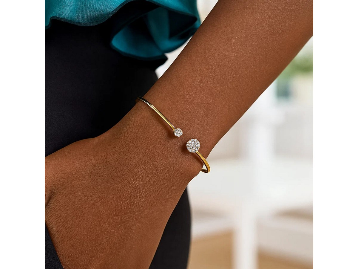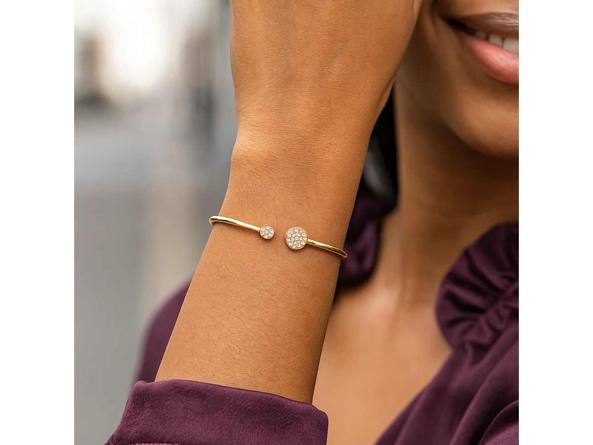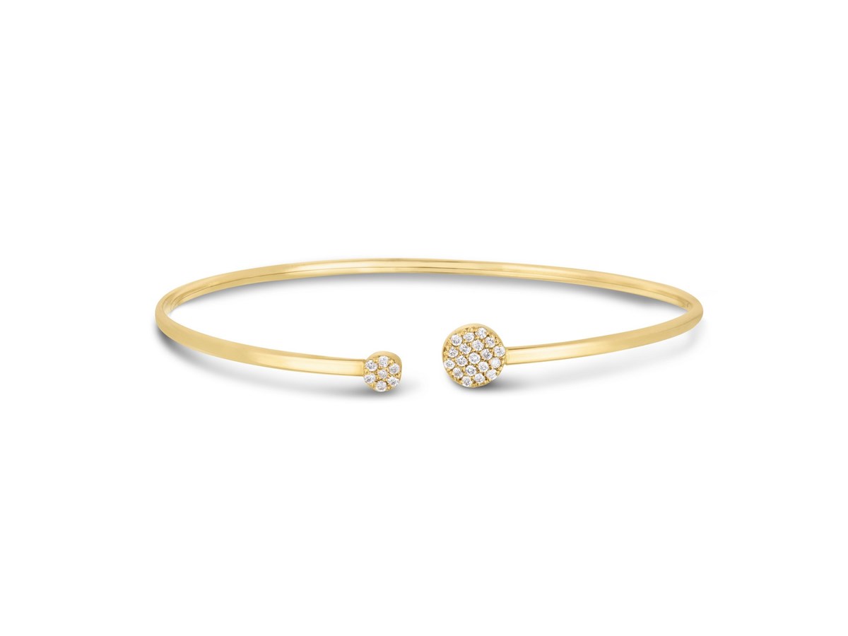 This Diamond Cluster bangle is an elegant addition to complete your perfect style. Two different sized round discs adorned with beautiful Pavé set diamonds creates a delicate look, crafted in 14k yellow gold with a high polish finish.