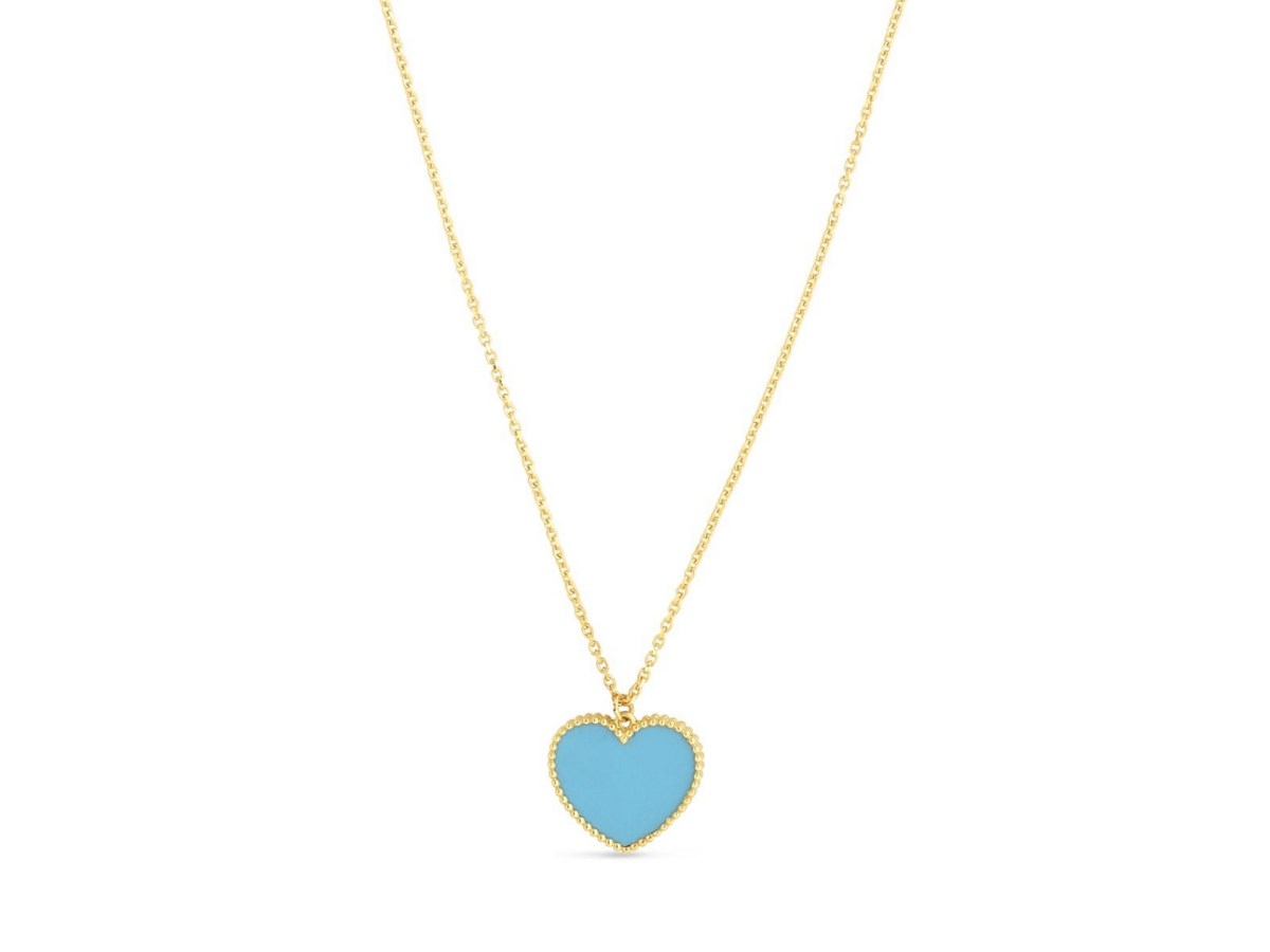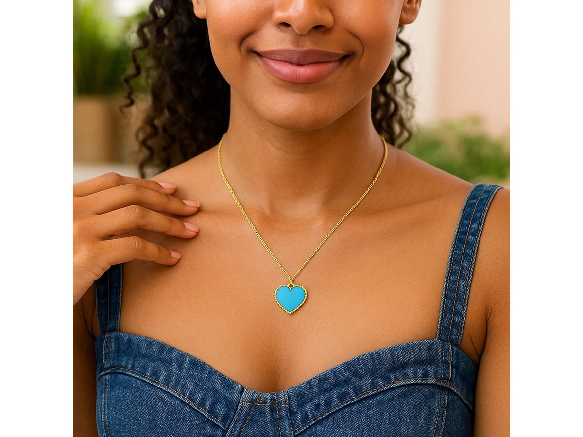 This Heart Turquoise Paste necklace will be that sweet pop of color you're looking for! A classy design that you'll need in your collection! Lightweight, high polish finish 14k yellow gold, moves freely along a cable chain & completed with a lobster clasp closure. Available in an 18 inches length.