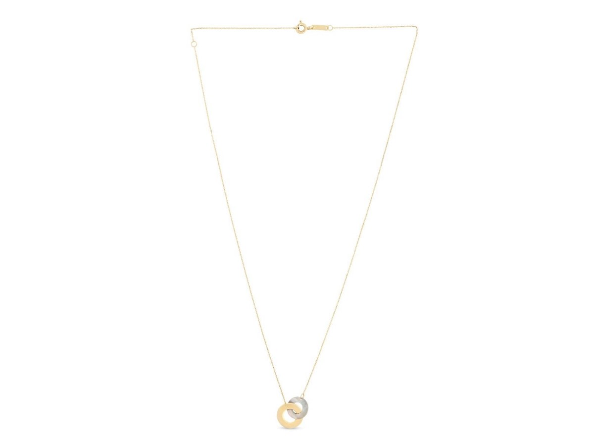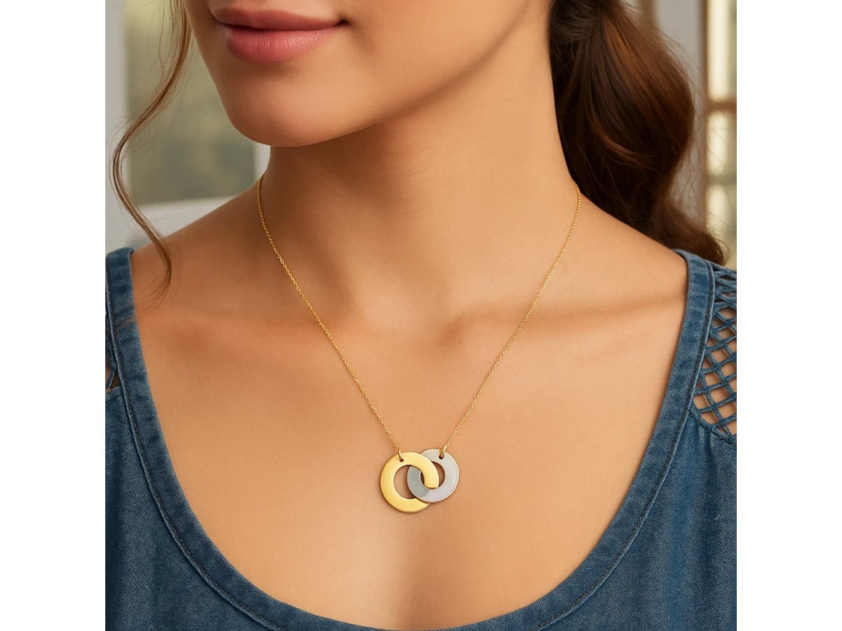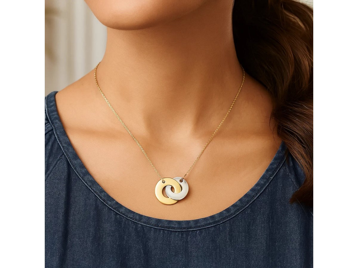 This Linked Mother of Pearl Circles necklace is a classy design with a stunning combination. Two open hoops interlock, one in mother of pearl & one in 14k yellow gold. Crafted in 14k yellow gold with a high polish finish, hangs along a dainty chain with a spring clasp closure. Necklace can be worn at 16 or 18 inches.