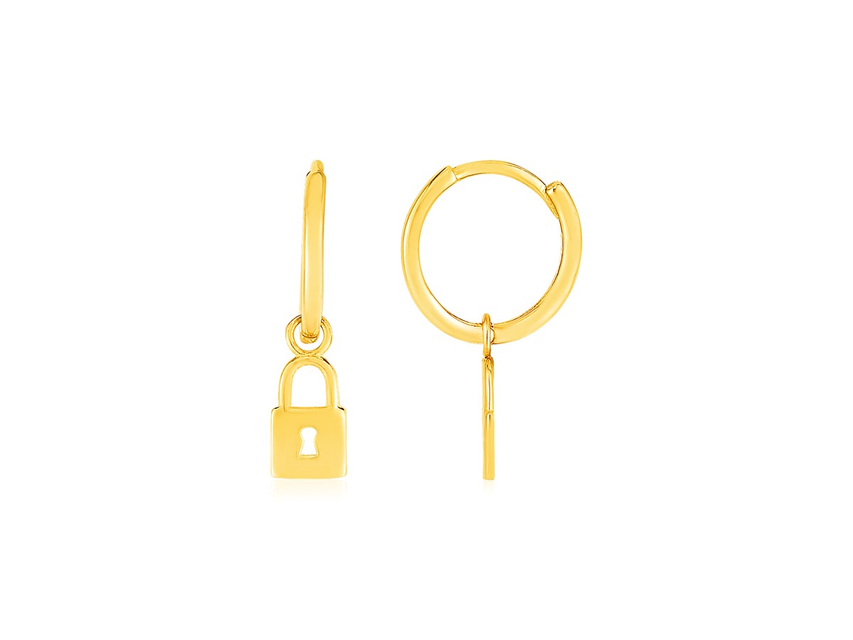 14k Yellow Gold Huggie Style Hoop Earrings with Padlock Drops