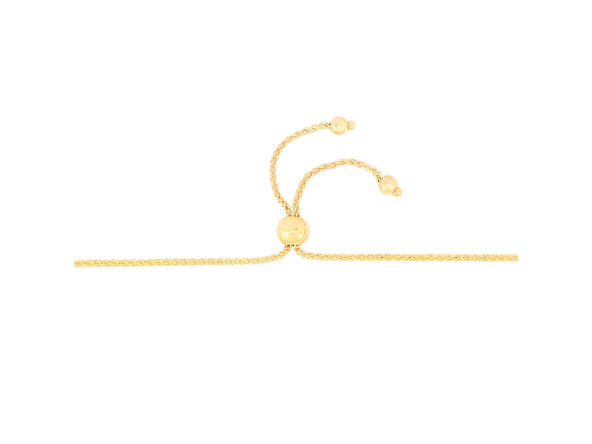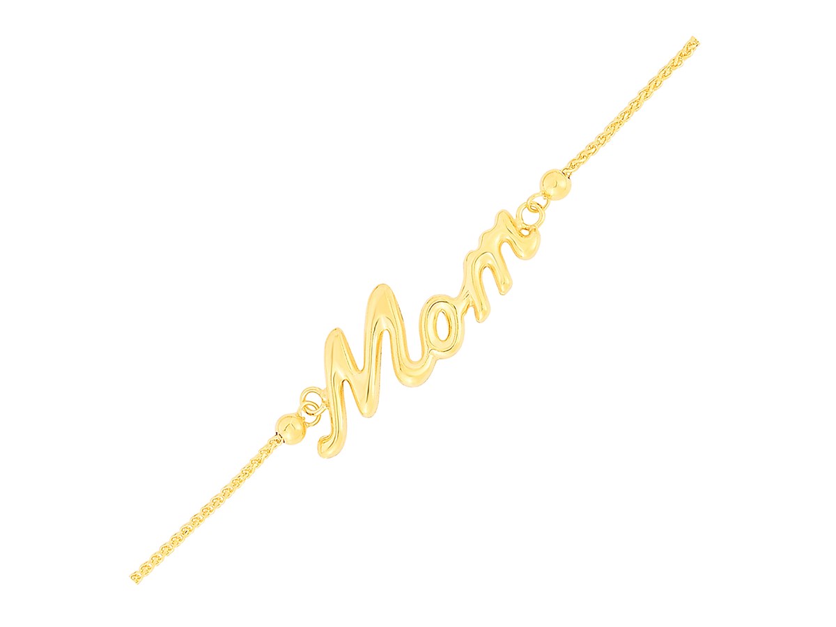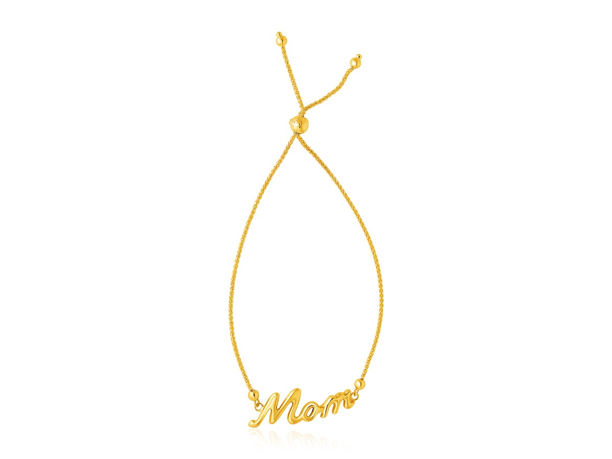 This sweet and beautiful bracelet features a MOM in script design and a delicate diamond cut wheat chain. Made of 14k yellow gold, this comes with an adjustable drawstring lariat closure.