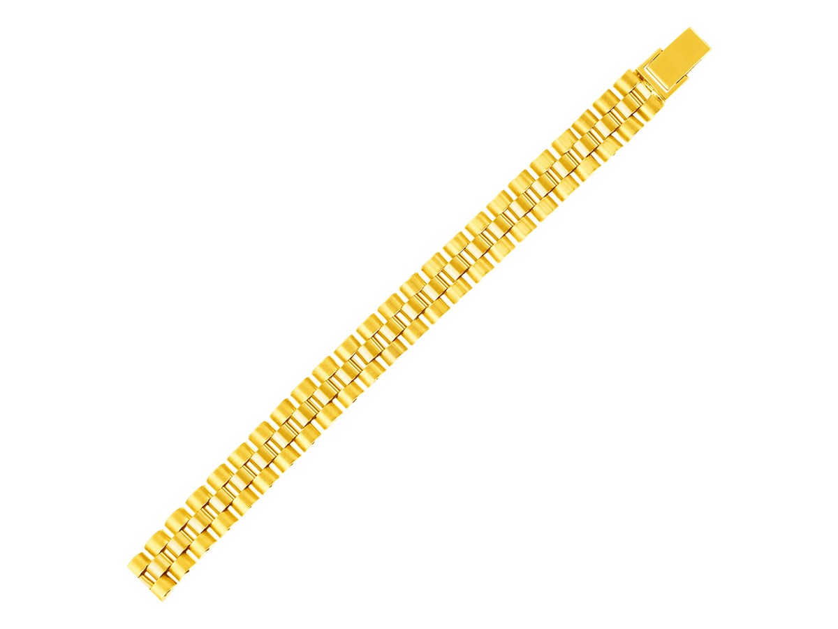 An elegant and bold classic for men, this eye-catching 14k yellow gold panther link bracelet combines smooth design with bright shine. Bracelet is 8 1/2 inches long, 9.3mm wide, and closes with a snap clasp.