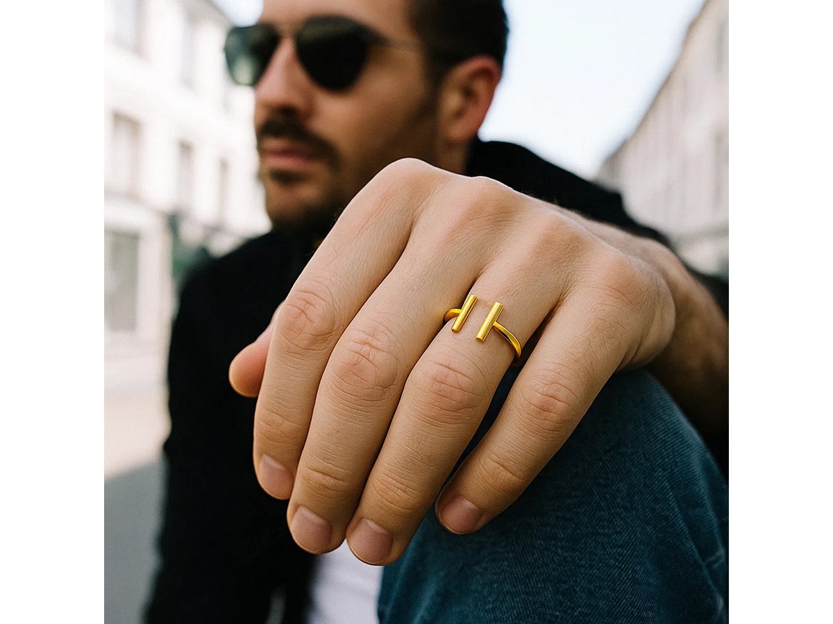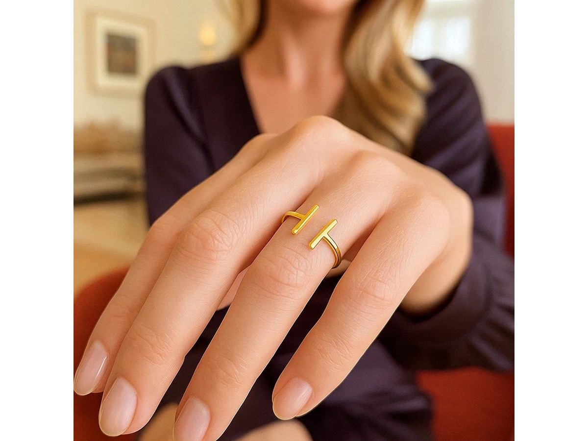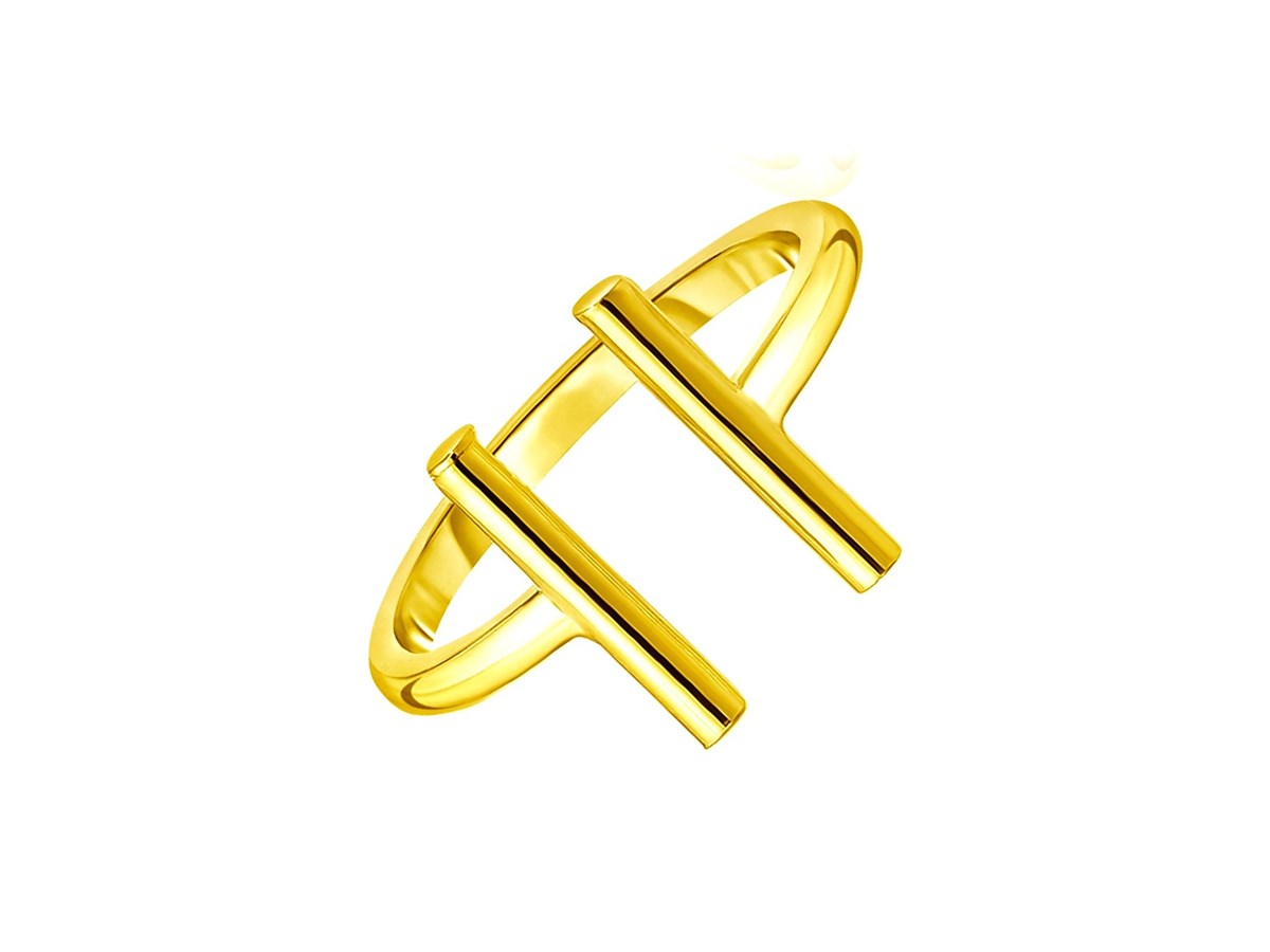Simple polished bars decorate this unique open-style 14k yellow gold ring. Ring size 7.