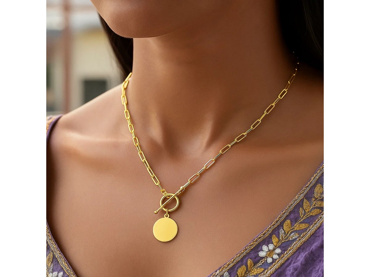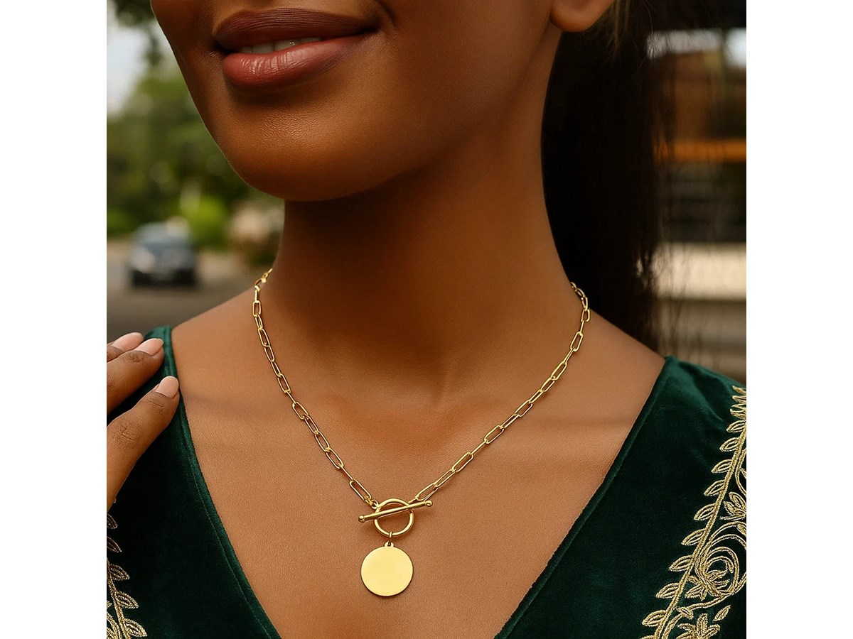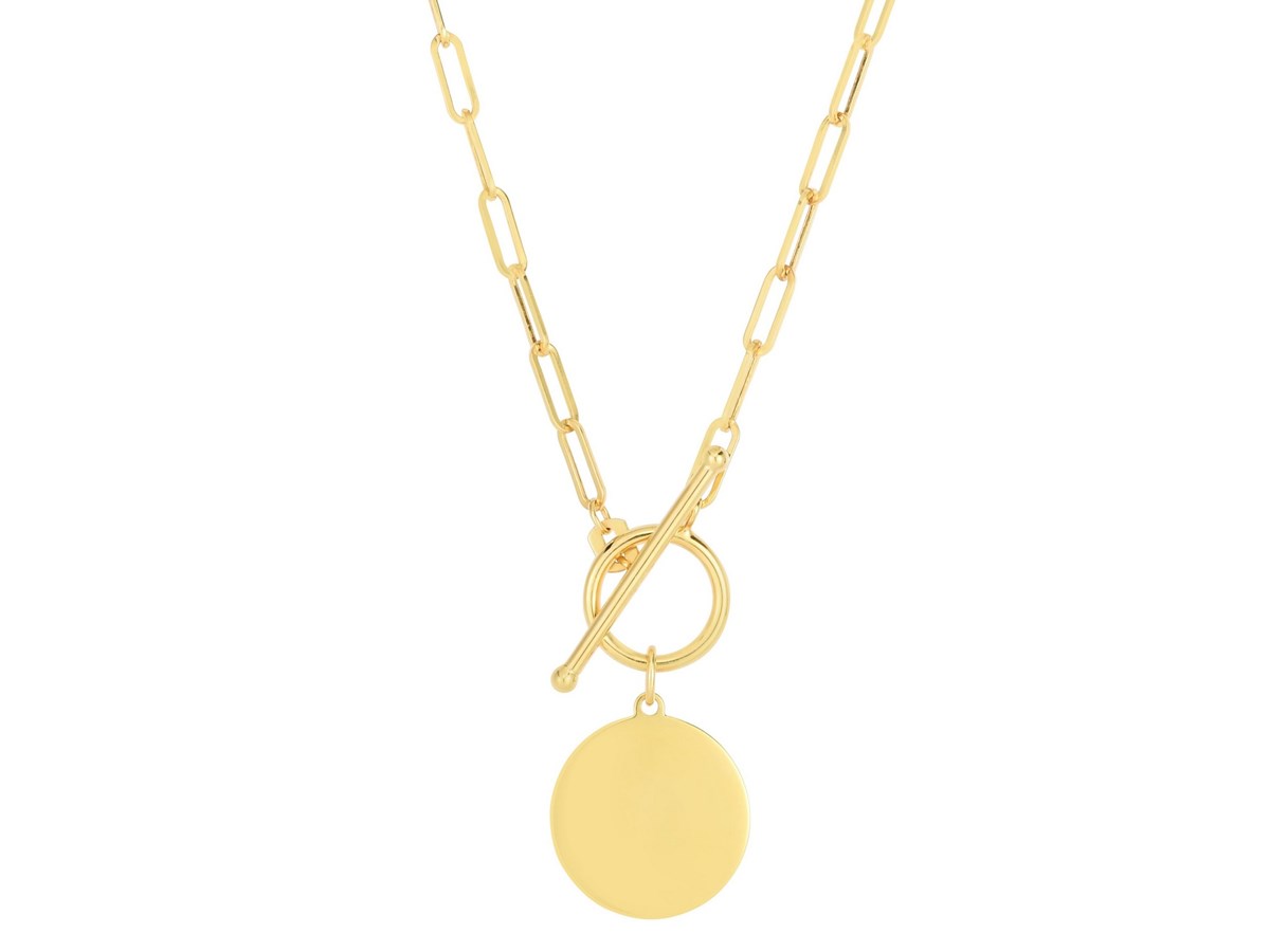 14k Yellow Gold Paperclip Chain Necklace with Circle Pendant