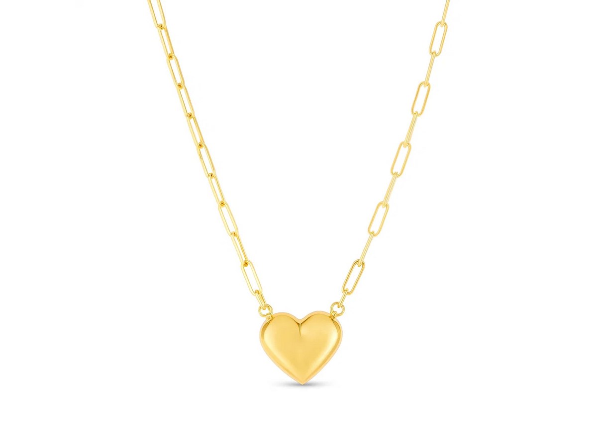 A classic puffed heart is the star of this timeless and elegant 14k yellow gold paperclip chain necklace. Necklace chain is 18 inches long and 2.5mm wide.