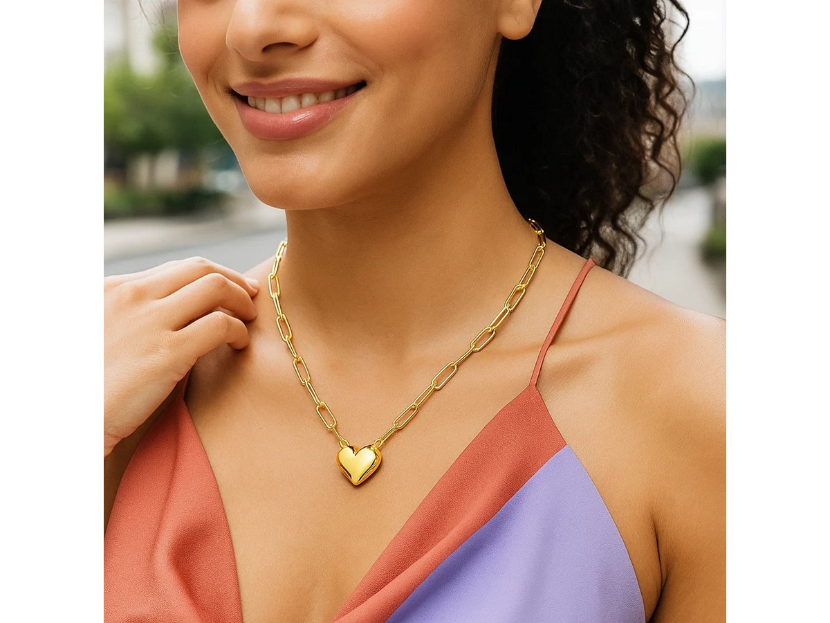 14k Yellow Gold Paperclip Chain Necklace with Puffed Heart