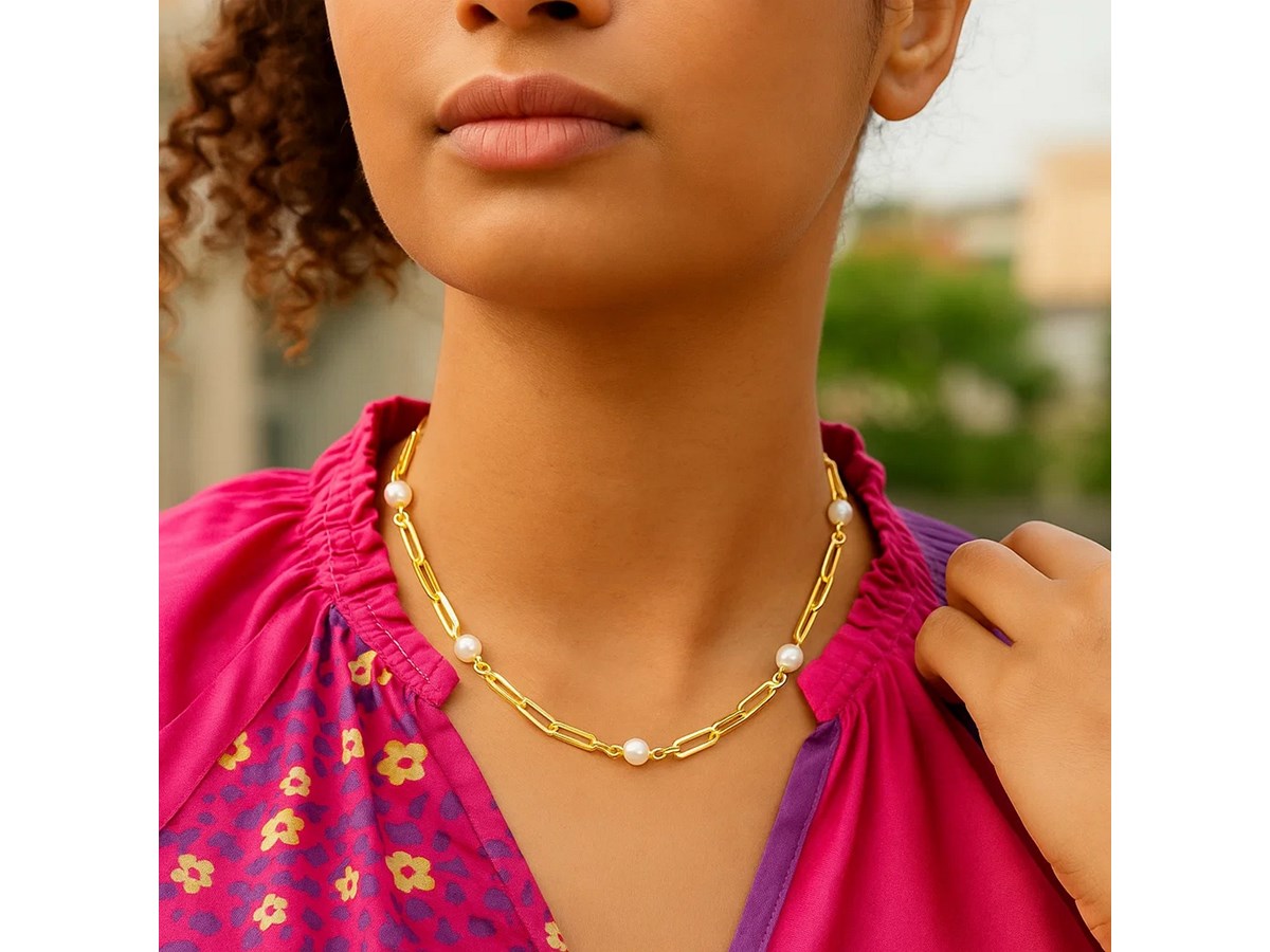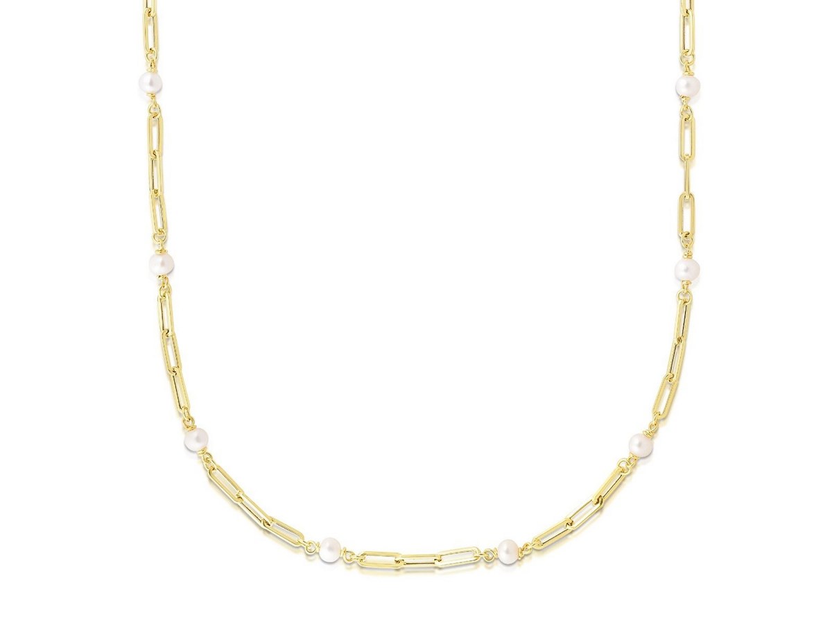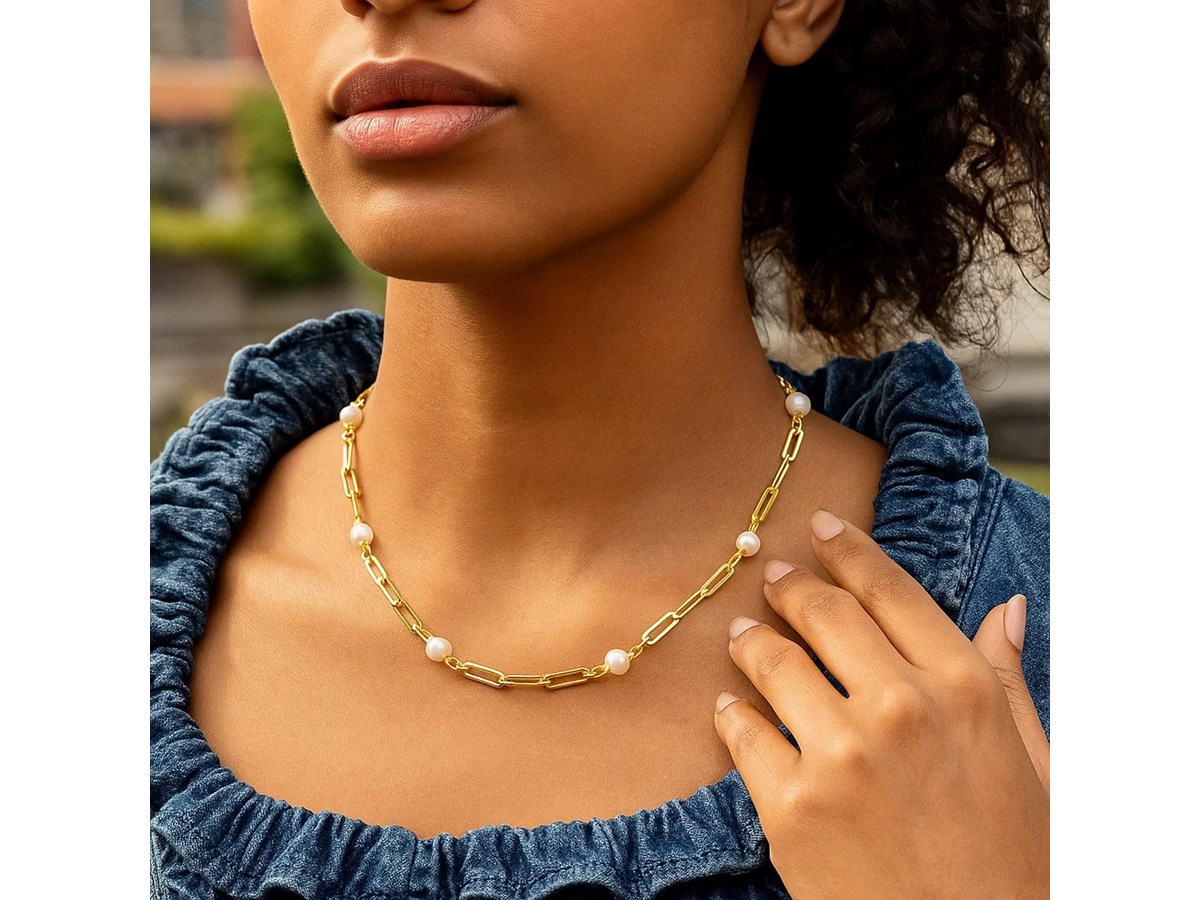 Lovely stations of freshwater pearls beautifully accent 14k yellow gold paperclip chain on this elegant necklace. Necklace is 24 inches long.