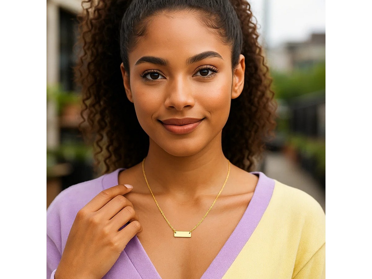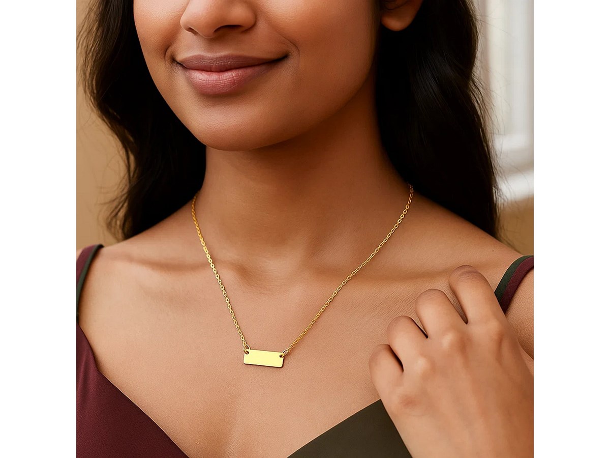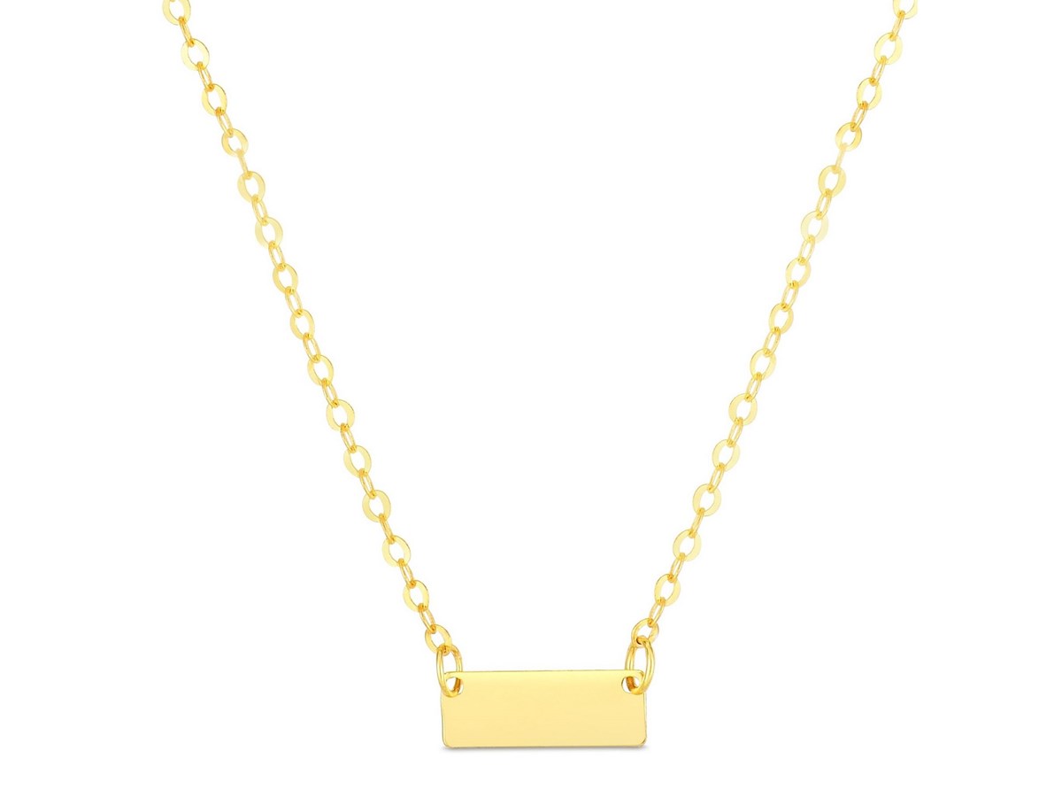 This brilliant 14k yellow gold necklace features a delicate, shiny gold bar. Necklace is 18 inches long.