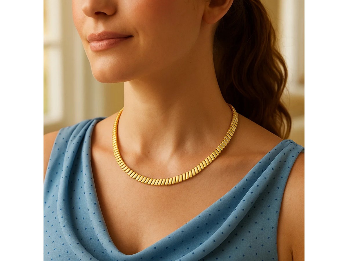 This Rib Link necklace is beautifully crafted in 14k yellow gold with a high polish finish and closes with a lobster clasp. Measuring at an 18 inches length.