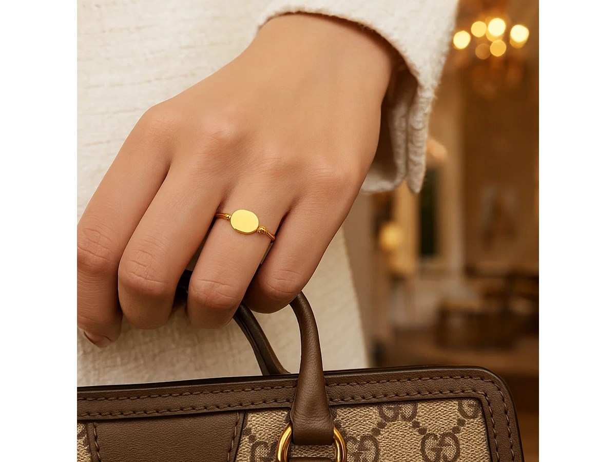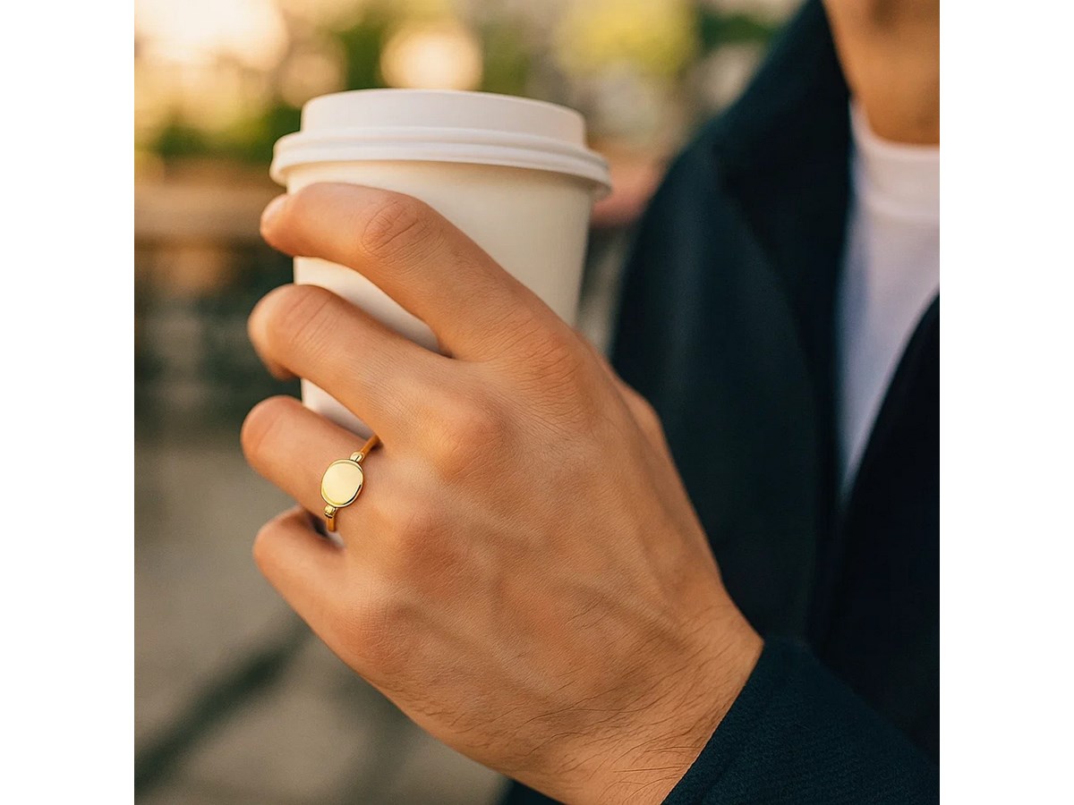 This simple, timeless 14k yellow gold ring is centered on a bright, polished oval. Ring size 7.