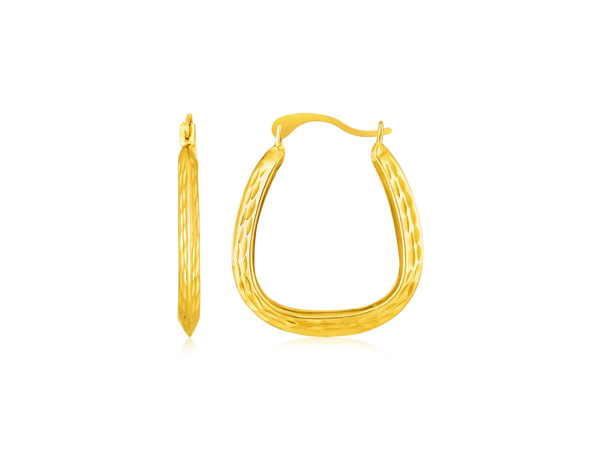 The unique squared-off profile of these elegant 14k yellow gold hoop earrings is further accentuated by lovely textured accents. Earrings are 22mm long and are held in place by hinged clasps.