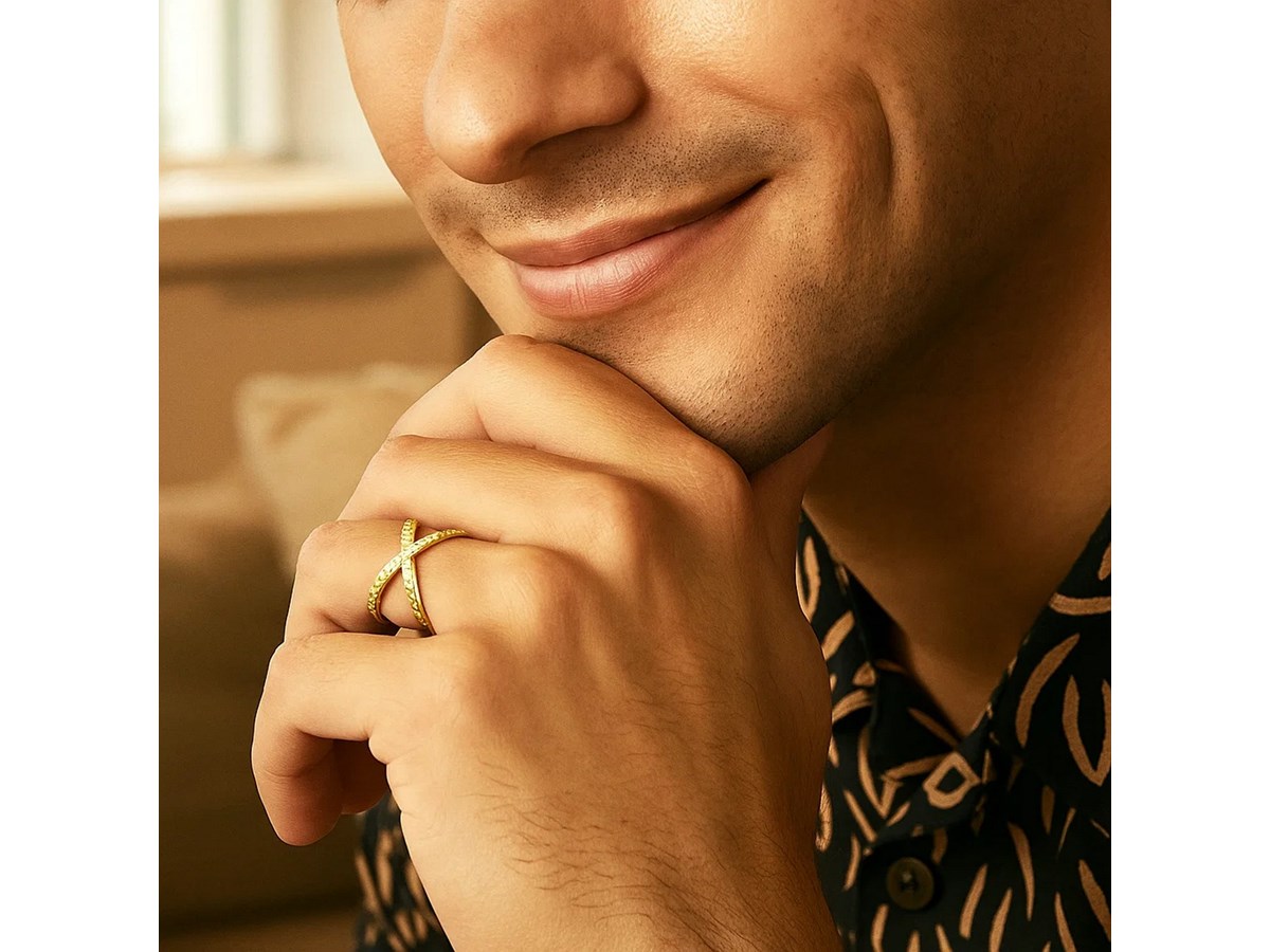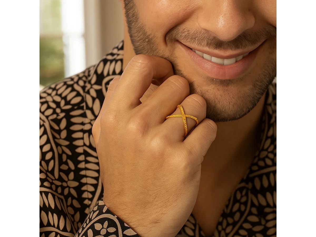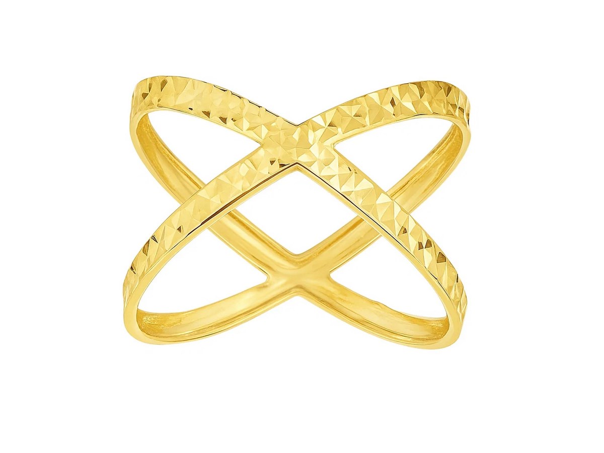 Traditional texture meets modern form in this intriguing "X" profile 14k yellow gold ring. Ring sizes 7 and 8.