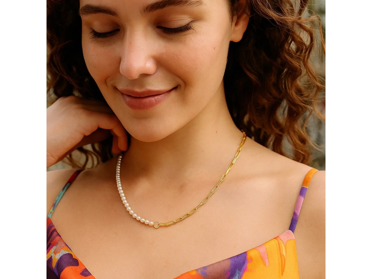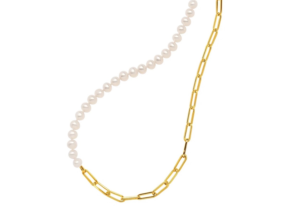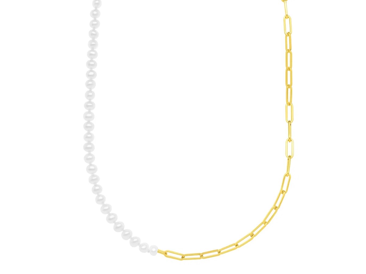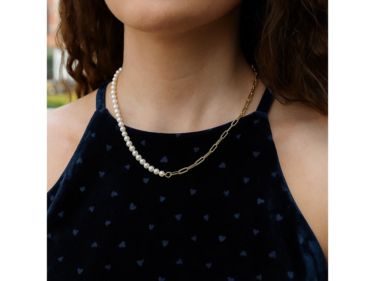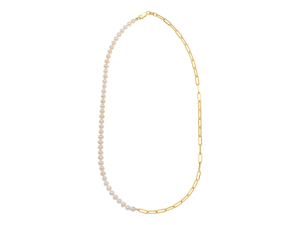 This 14k yellow gold necklace reimagines classic elegance with its asymmetrical design. It combines luminous white cultured pearls on one side with sleek paperclip links on the other. The bold contrast between the pearls and the gold links creates a striking interplay of texture and style. This contemporary necklace offers a modern take on classic elements, perfect for those who appreciate sophisticated jewelry. Secured with a lobster clasp closure.