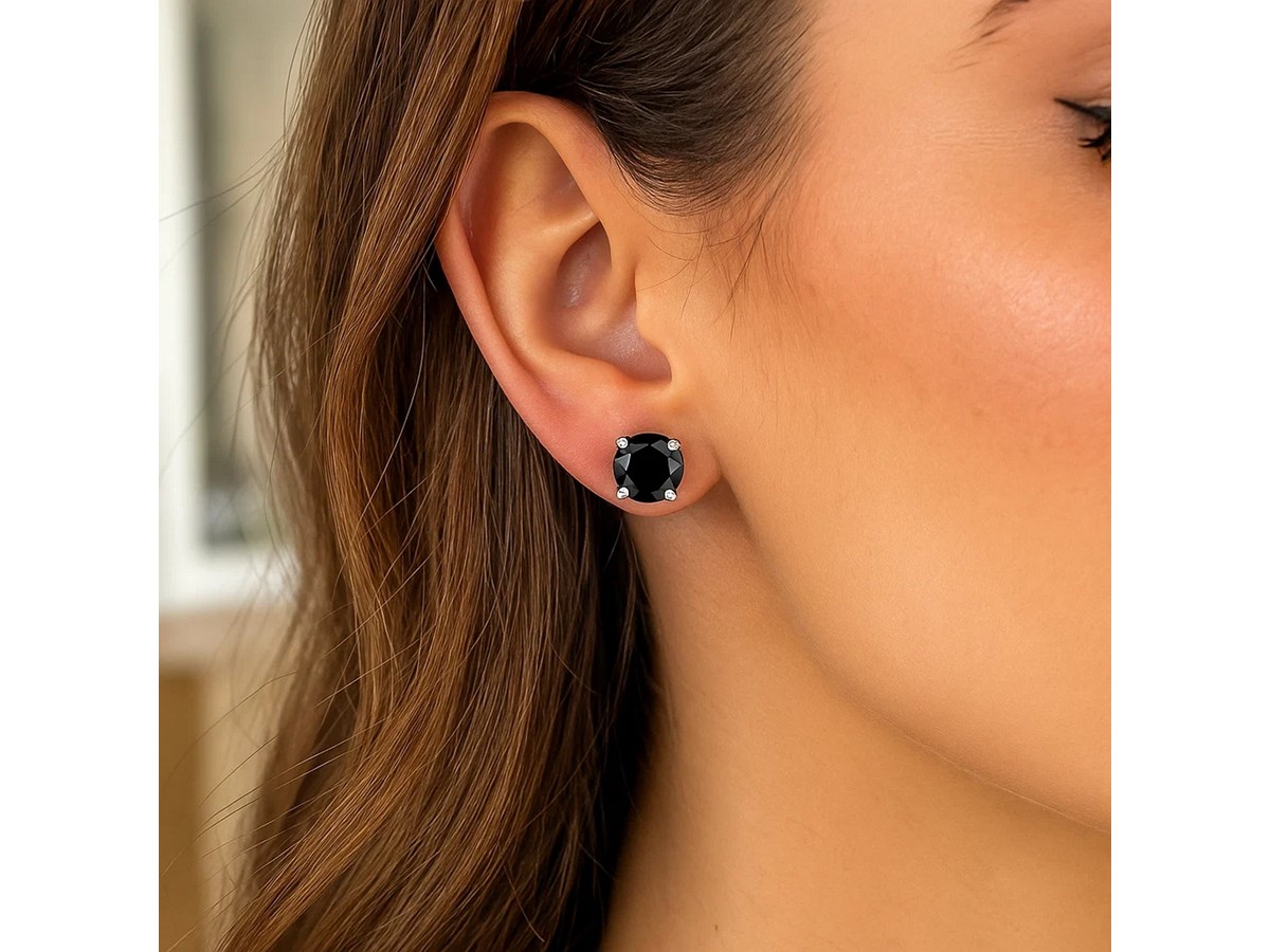 Our dramatic 8.0 millimeters round black CZ stud earrings feature prong settings with push back closures in 14k white gold.