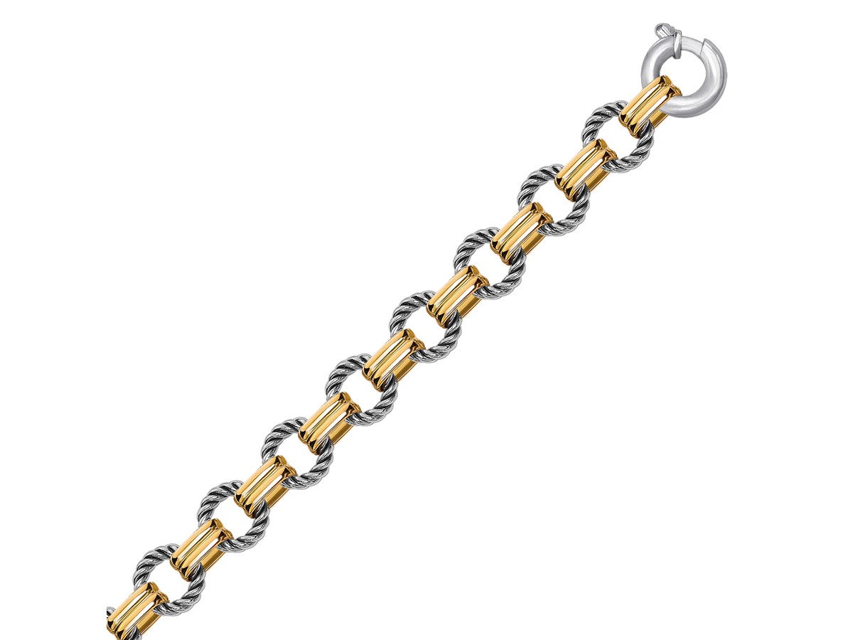 This bracelet is quite fashionable with its alternating links of polished 18k yellow gold and round cable inspired sterling silver sections. Measures 7 1/2 inches and comes with a spring ring lock.