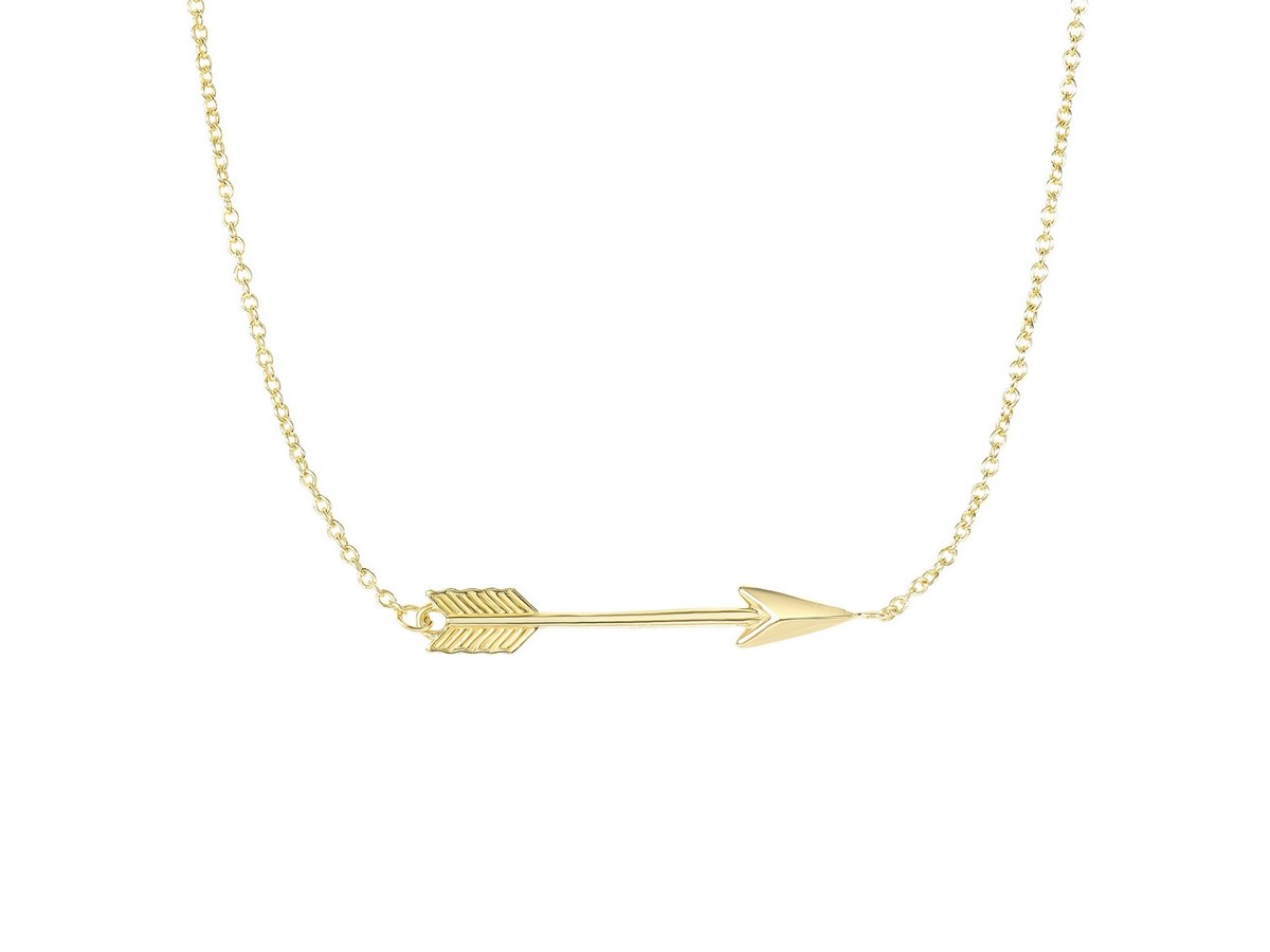 A delightfully designed 14k yellow gold chain necklace with a horizontal arrow bar. Measures 18 inches and secured with a lobster lock.