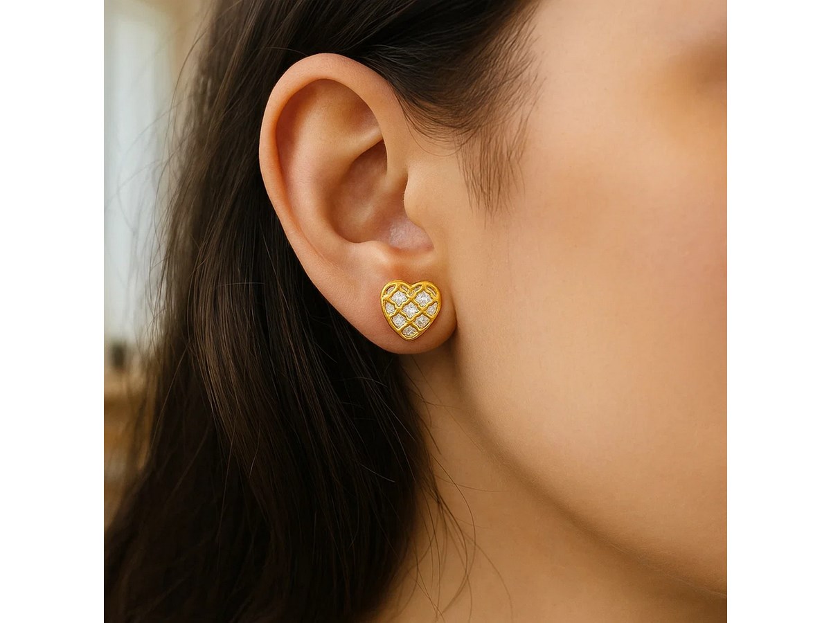 Checkered Heart Stud Earrings in 14K Yellow Gold
