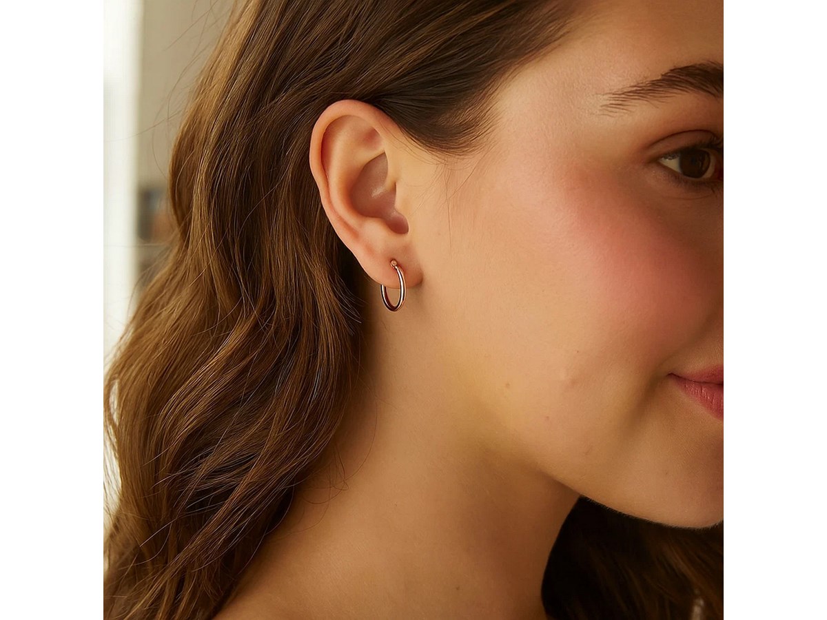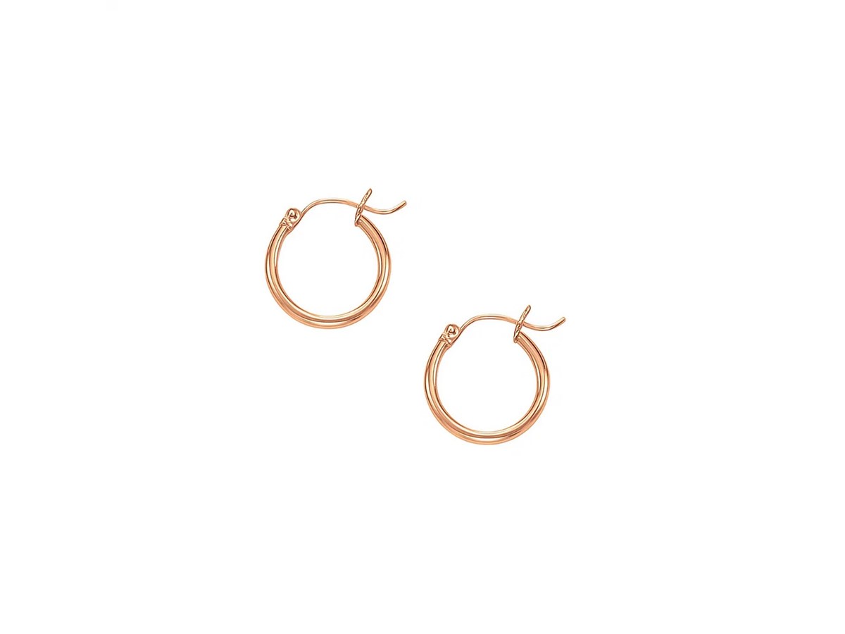 Elegant 14K rose gold classic hoop earrings measuring 2x15 mm. Featuring a warm, polished finish and a secure hinged snap back closure, these petite hoops add a touch of timeless sophistication, perfect for everyday wear or subtle elegance on any occasion.