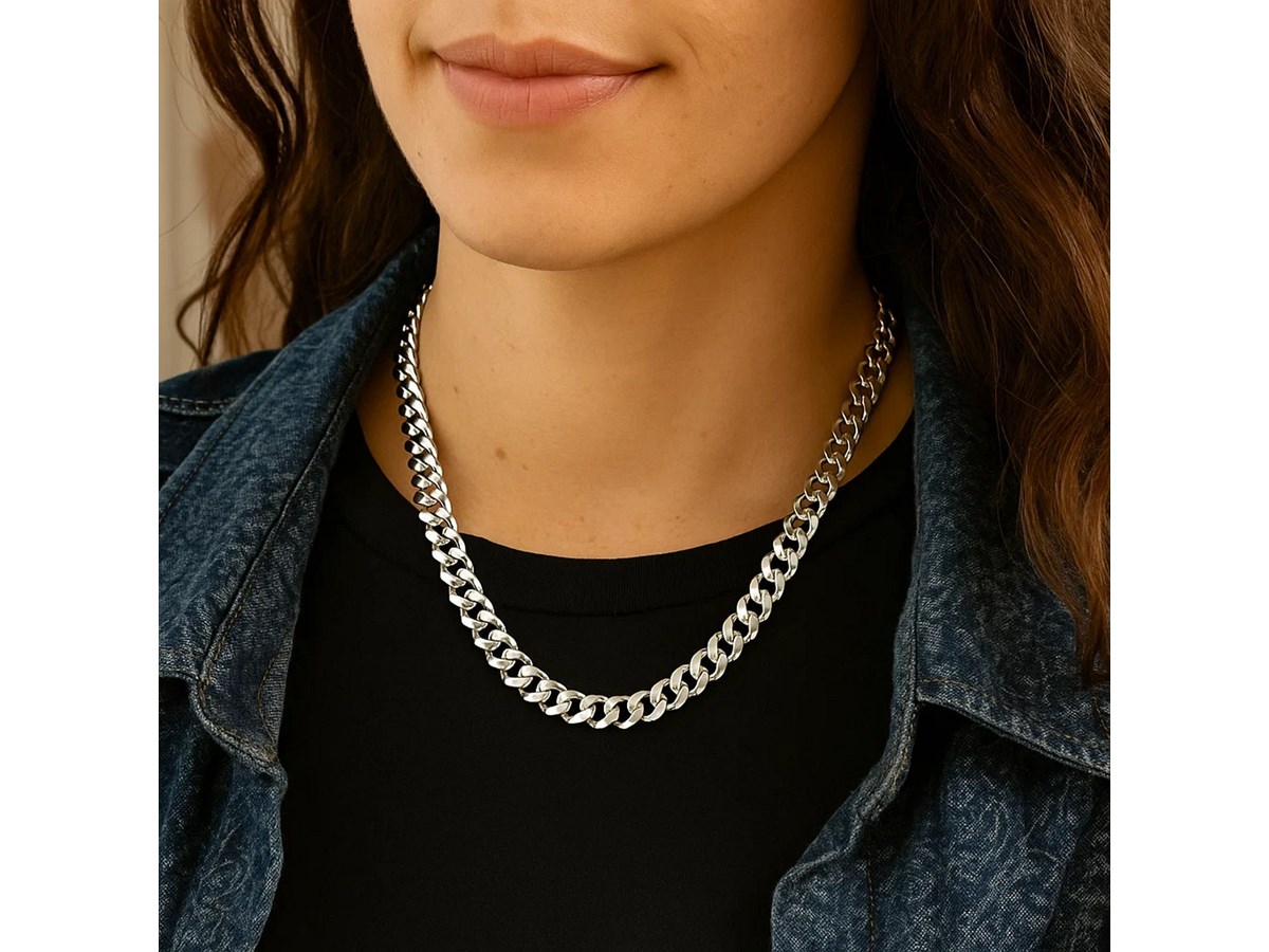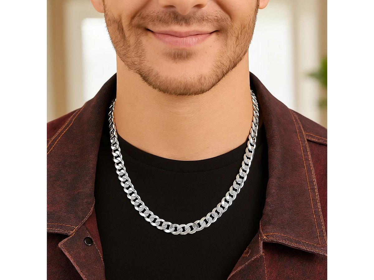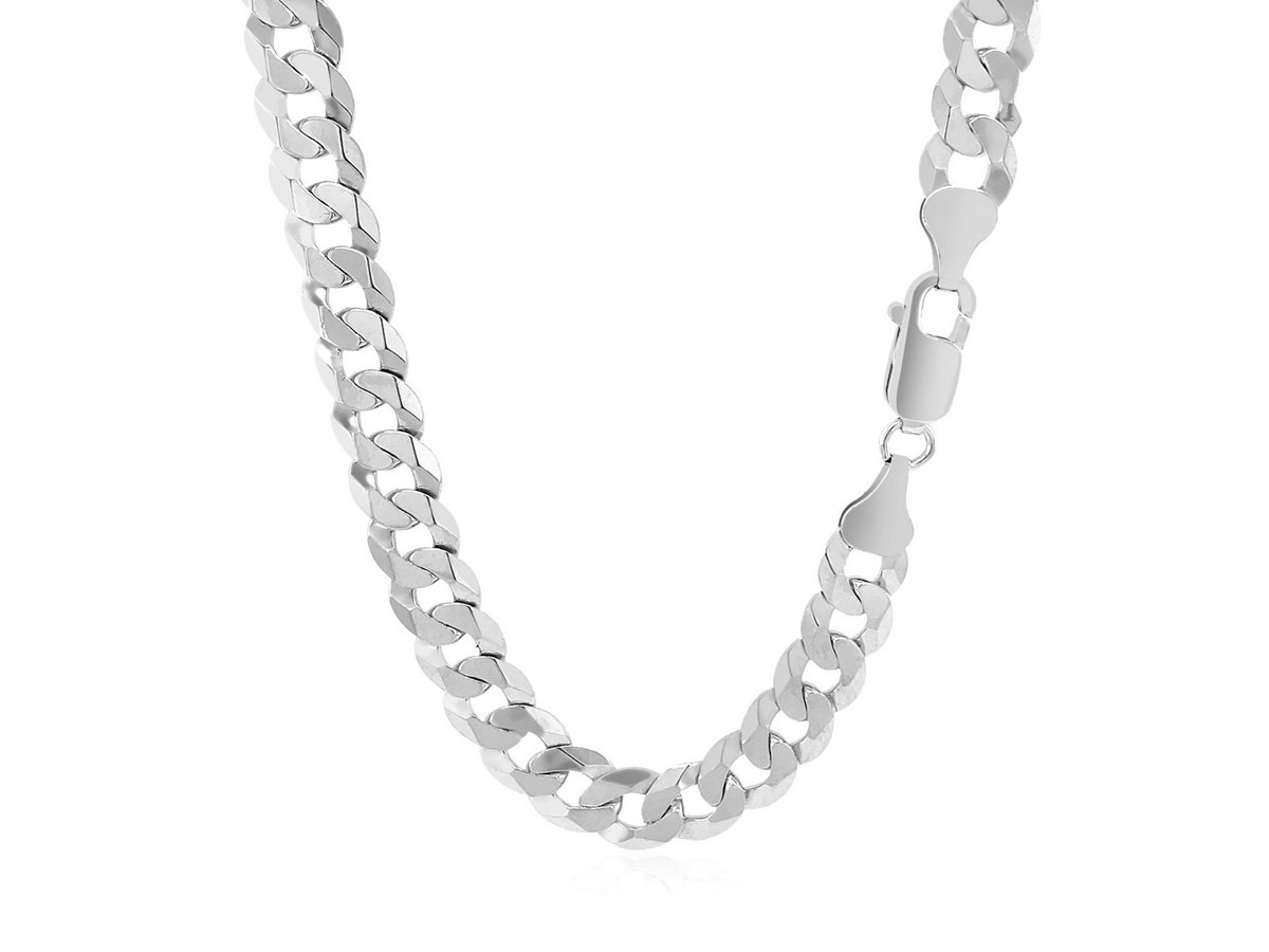 Classic rhodium plated curb chain crafted in 925 sterling silver measuring 7.90 millimeters in width and featuring a lobster clasp closure. Available in lengths 20 inches, 22 inches and 24 inches.