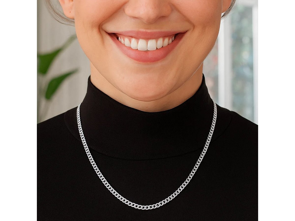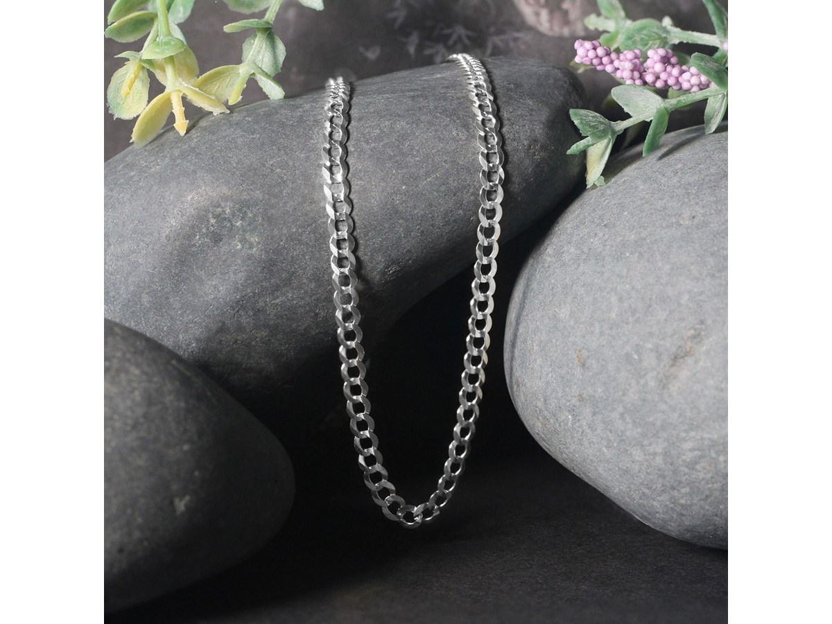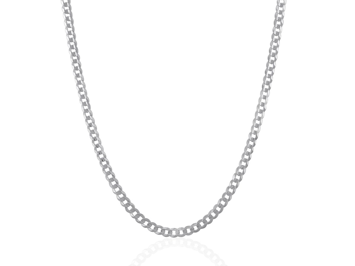 Classic rhodium plated curb chain crafted in sterling silver measuring 3.7 millimeters in width and featuring a lobster clasp closure. Available in lengths 16 inches, 18 inches, 20 inches and 24 inches.