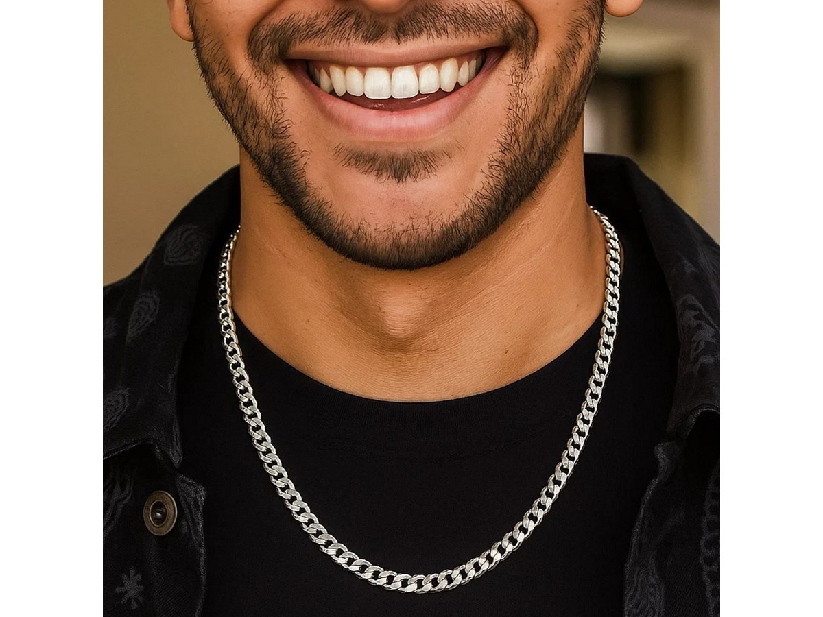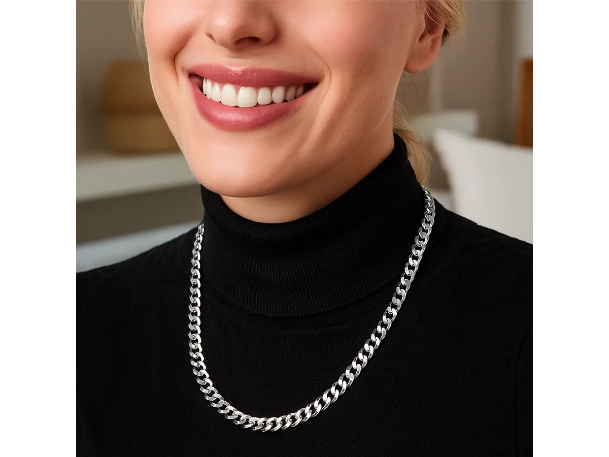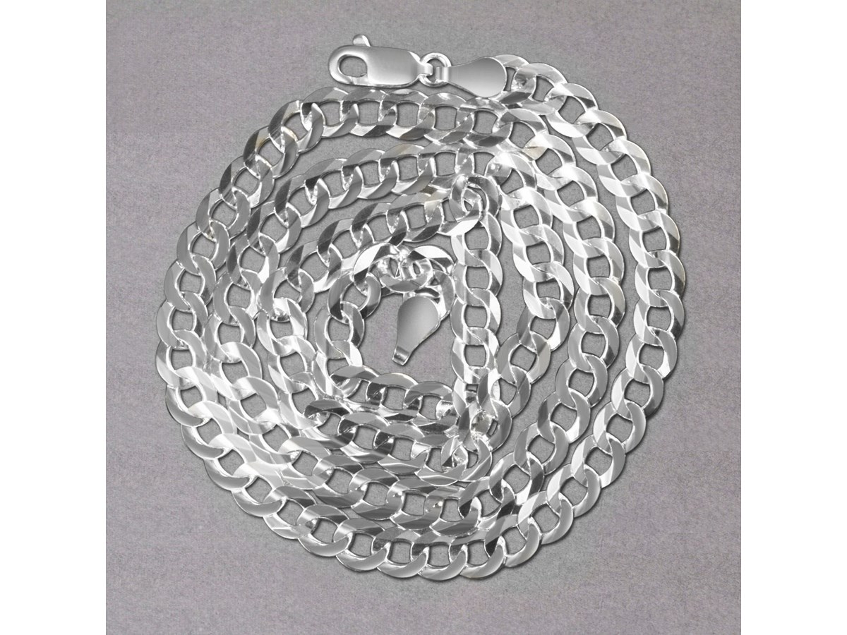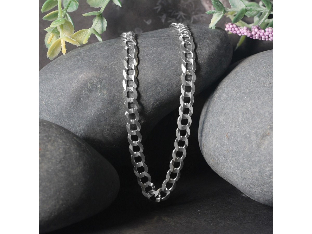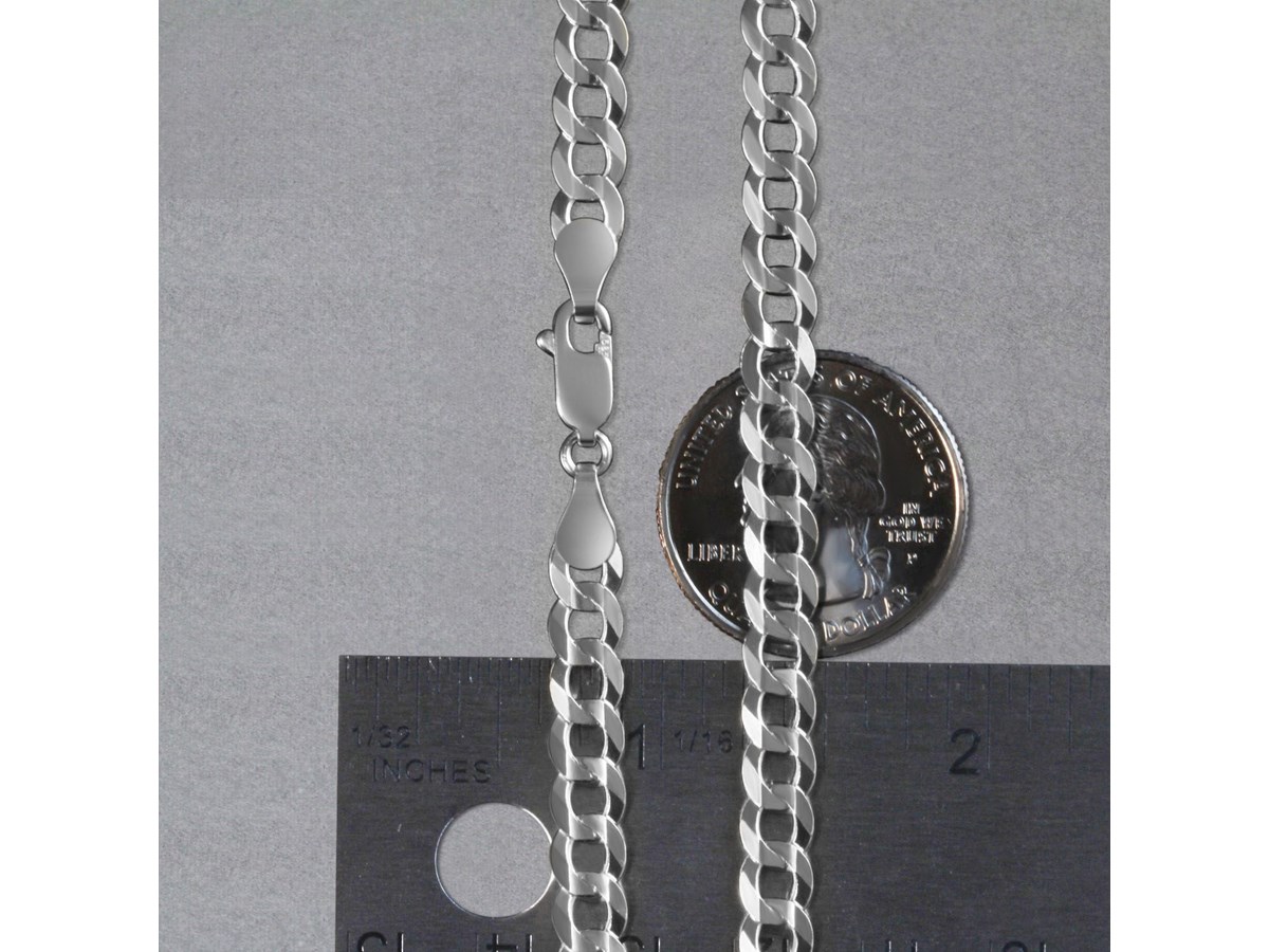 Classic rhodium plated curb chain crafted in sterling silver measuring 5.50 millimeters in width and featuring a lobster clasp closure. Available in lengths 20 inches, 22 inches, 24 inches and 30 inches.