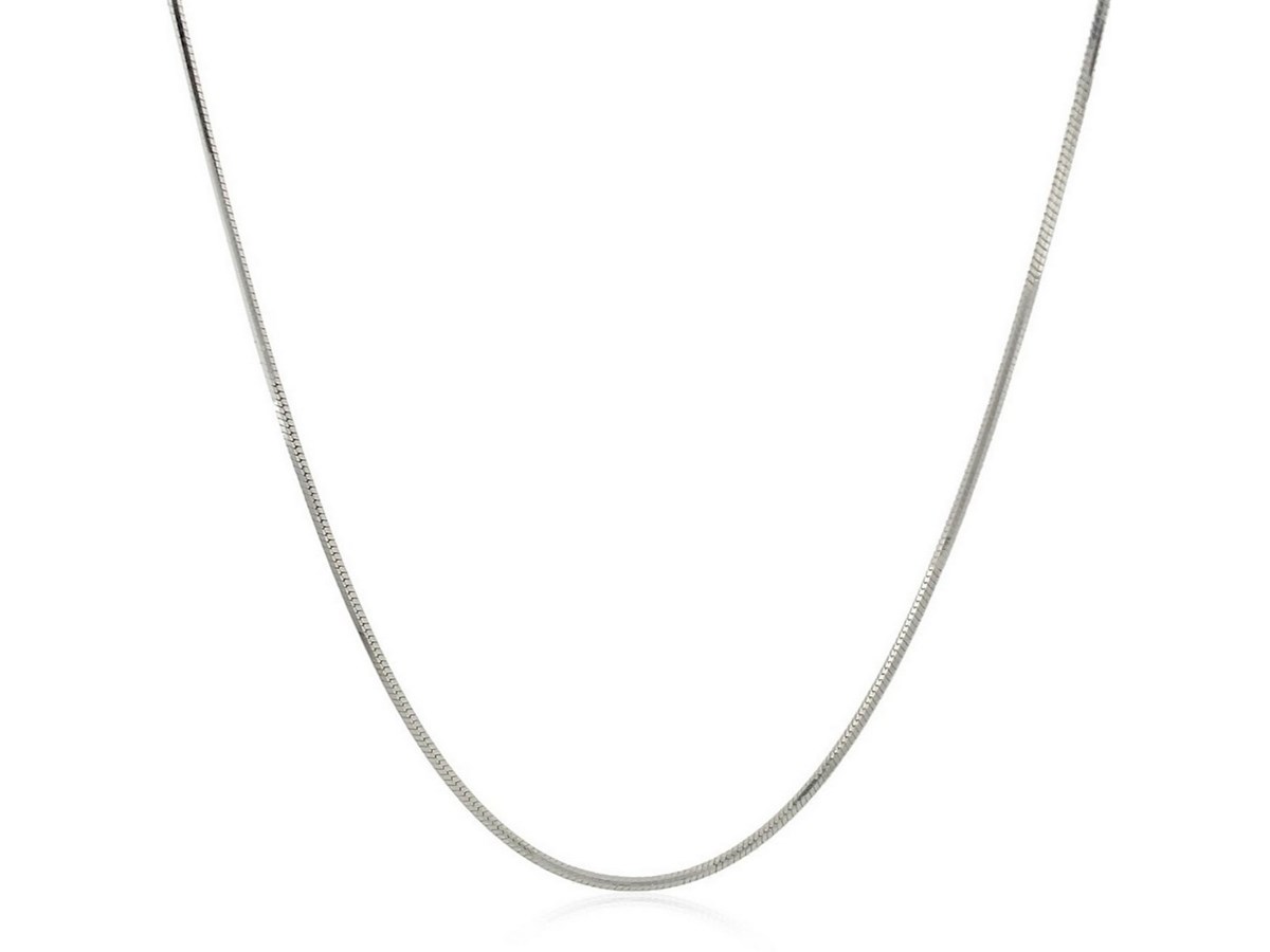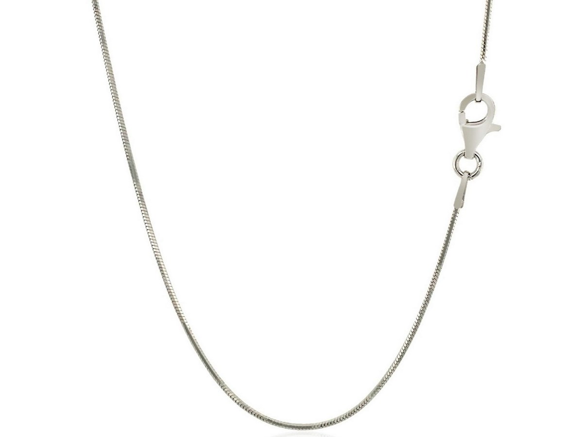 Classic rhodium plated snake chain crafted in 925 sterling silver measuring 1.3 millimeters in width and featuring a lobster clasp closure. Available in lengths 16 inches, 18 inches, 20 inches and 24 inches.