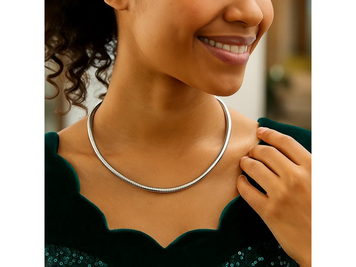 A classic neck ornament crafted in sterling silver. This beautiful omega design necklace is secured with a lobster clasp and is available in sizes 16 inches, 18 inches and 20 inches.