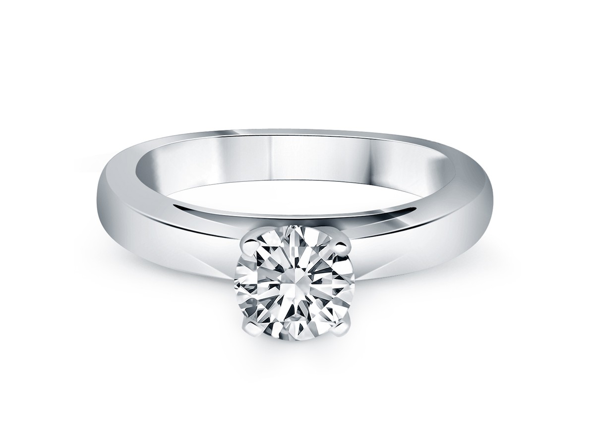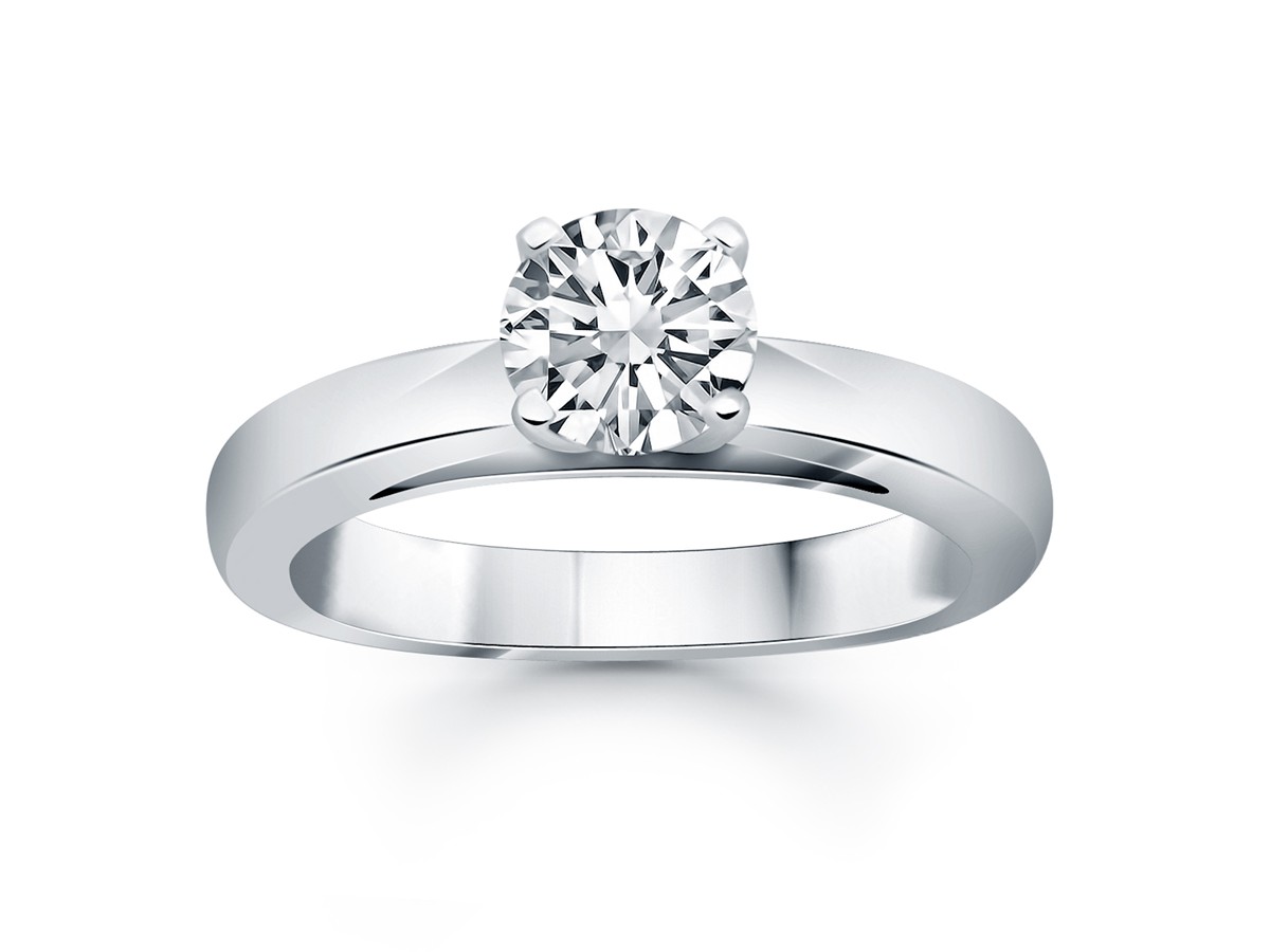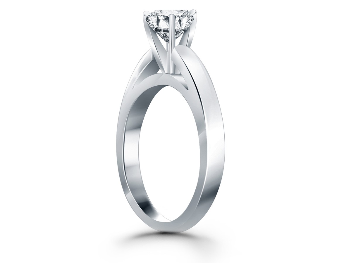 This classic cathedral solitaire engagement ring mounting features a wide band and a high polish, expertly crafted in 14k white gold. Center stone and setting is not included.