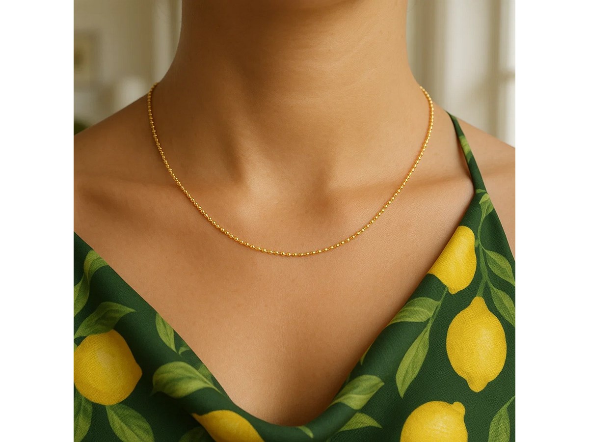 Diamond cut bead chain crafted in 14k yellow gold measuring 0.90 millimeters in width. Available in lengths 16 inches, 18 inches and 20 inches.