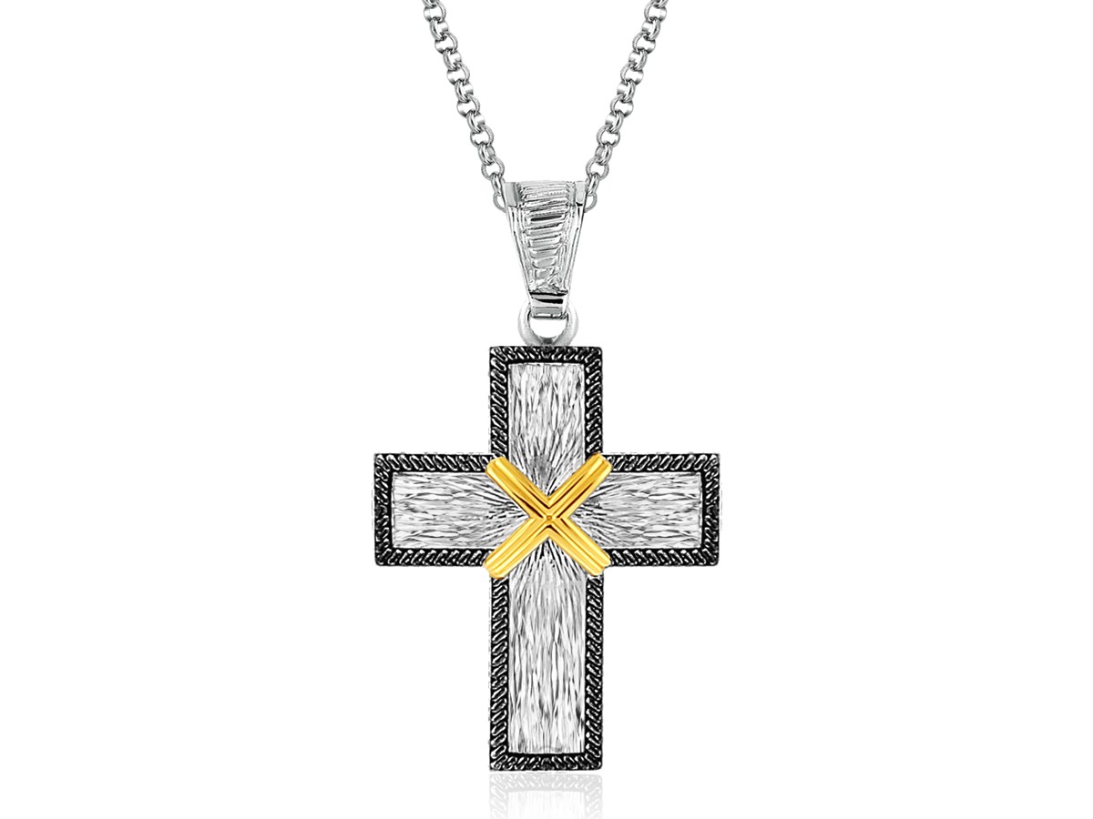 A tasteful symbol of spirituality, this expertly crafted cross features an antique finish on the border and a sparkling diamond cut surface. The 14K gold detail adds warmth and contrast. 18" cable chain is included.