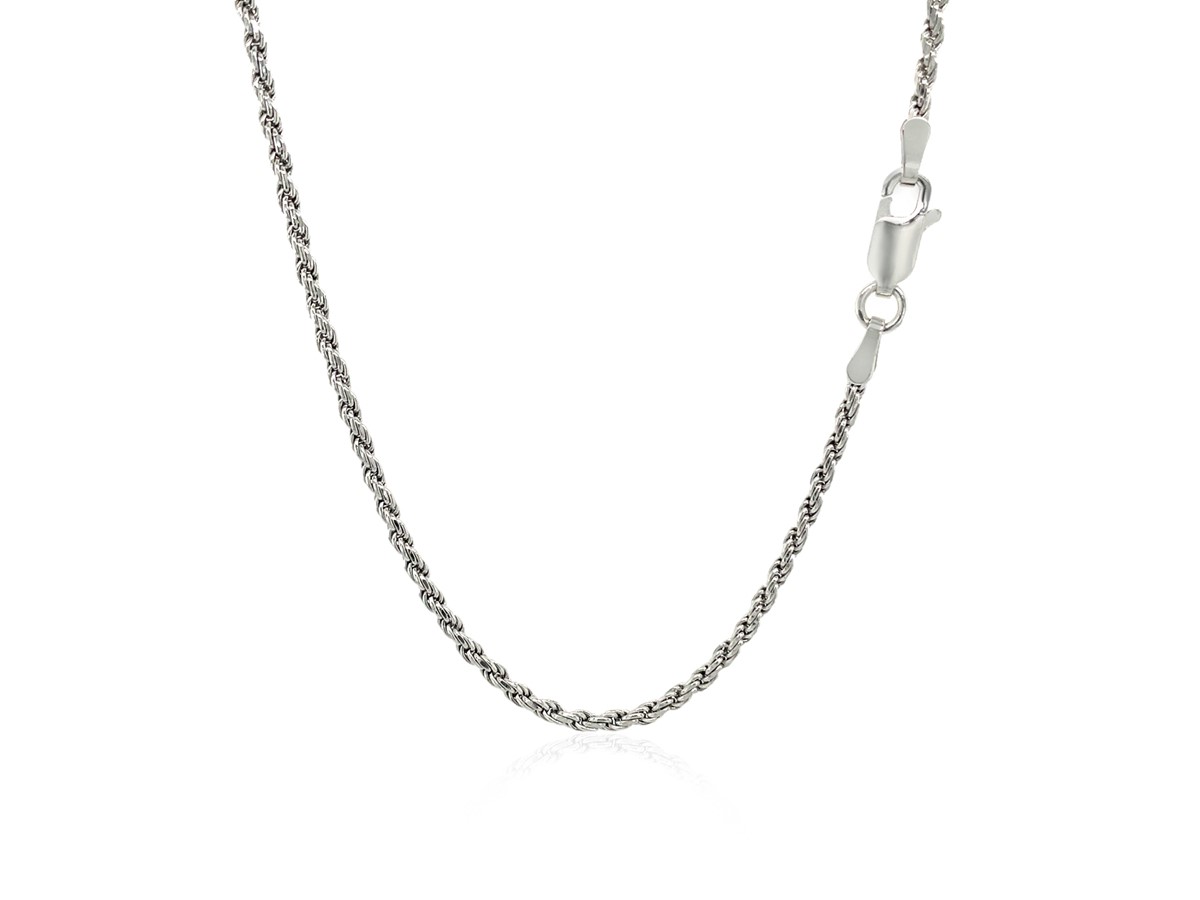 Diamond cut rope chain crafted in 925 sterling silver featuring lobster clasp closure and measuring 1.8 millimeters in width. Available in lengths 16 inches, 18 inches, 20 inches, 24 inches and 30 inches.