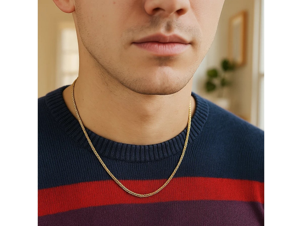 Diamond cut round wheat chain crafted in 14k yellow gold measuring 1.20 millimeters in width. Available in length 16 inches, 18 inches, 20 inches, 24 inches, and 30 inches.