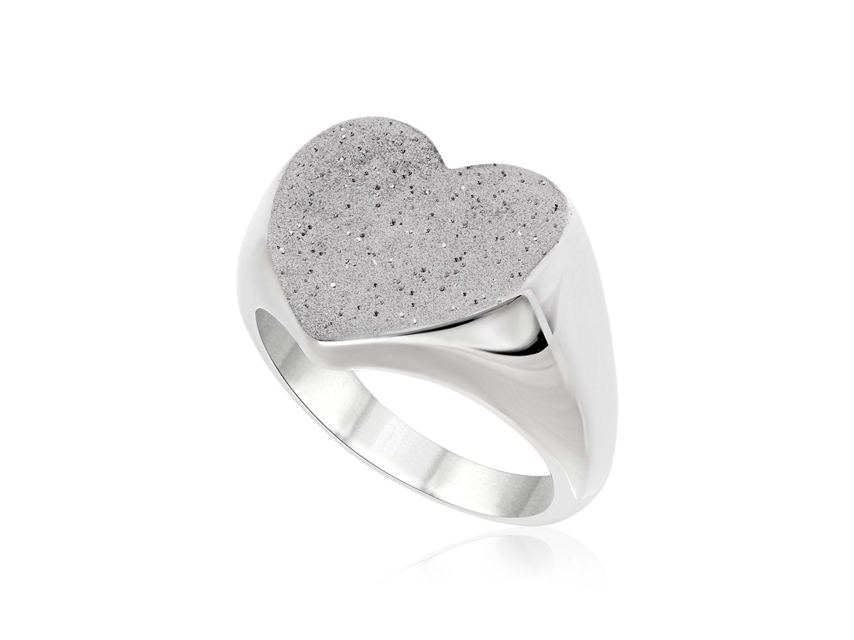 A delightful rhodium plated sterling silver ring with a stardust heart design and a polished band. Available in sizes 6 to 8.