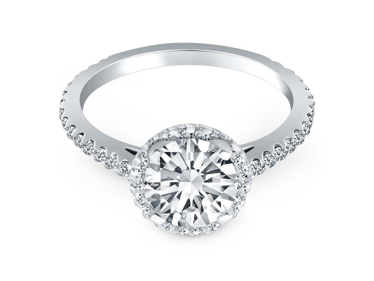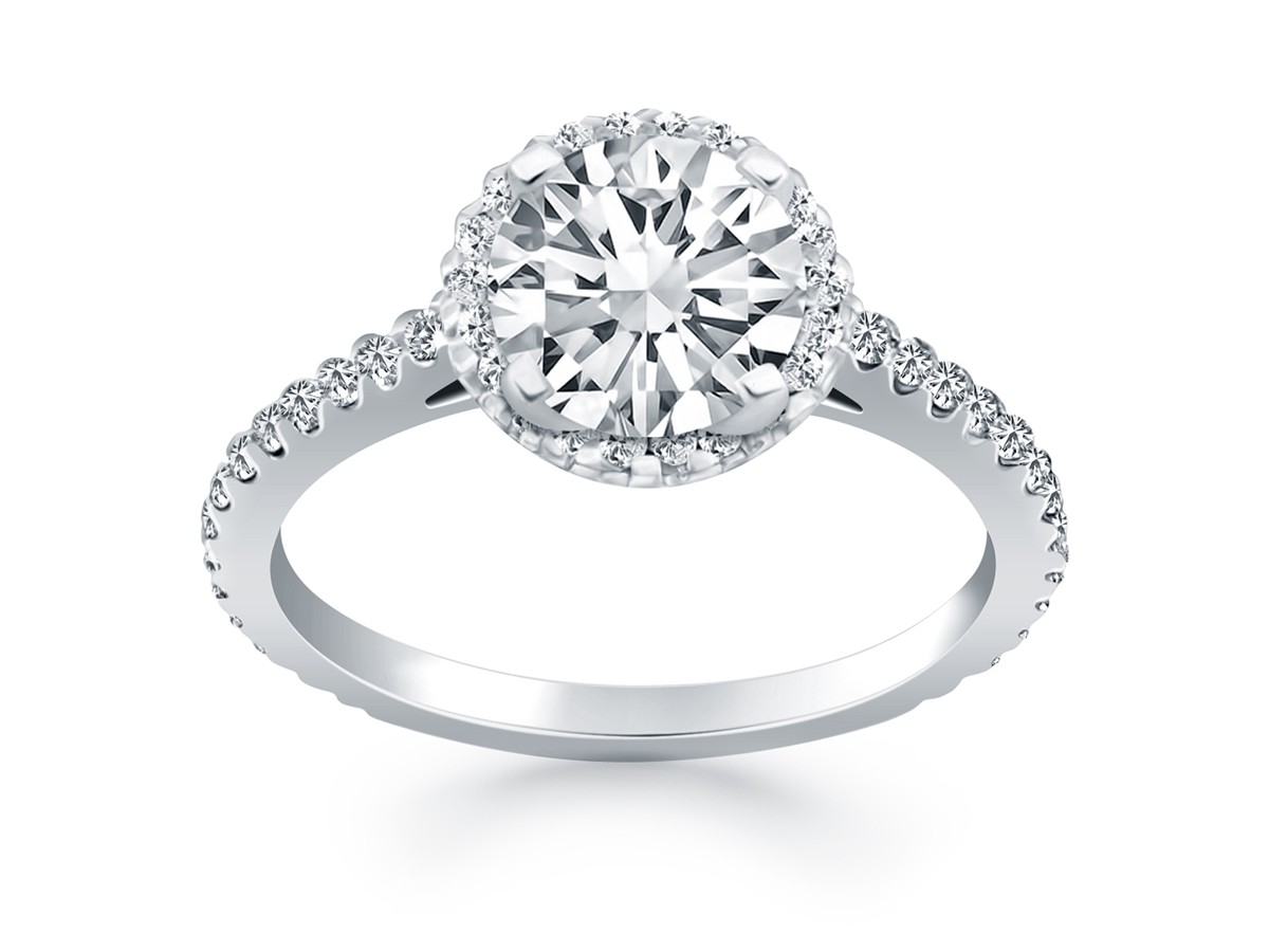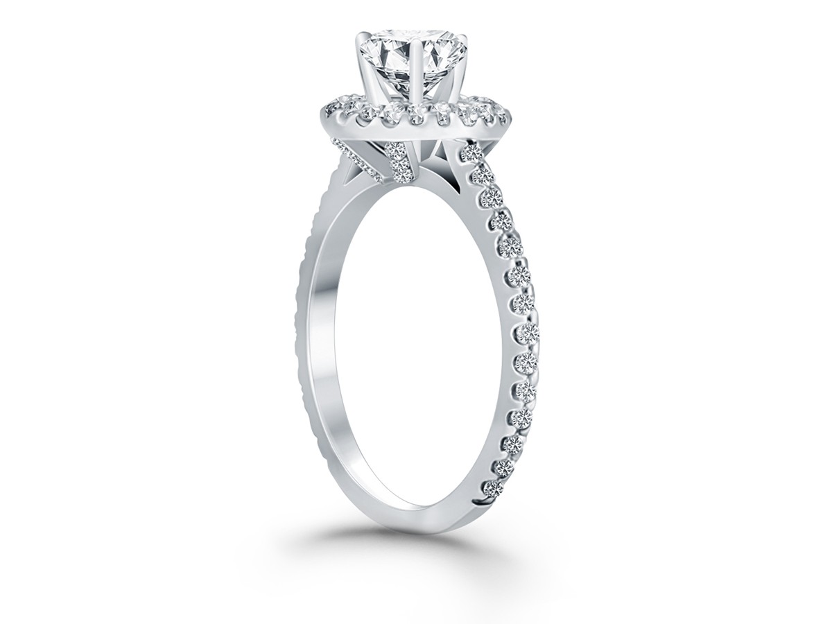 This elaborate cathedral engagement ring mounting features diamonds set along the band as well as diamonds under the pave halo. Expertly crafted in 14k white gold, the ring can accept a wide range of center stone shapes and sizes. Center stone and setting are not included.