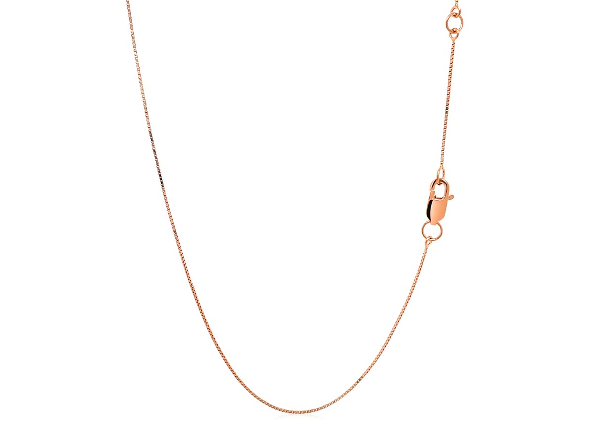 Double extendable box chain crafted in 14k rose gold measuring 0.51 millimeters in width. Extendable 16 to 18 inches in length and secured with a spring ring clasp.