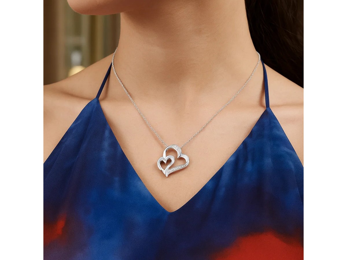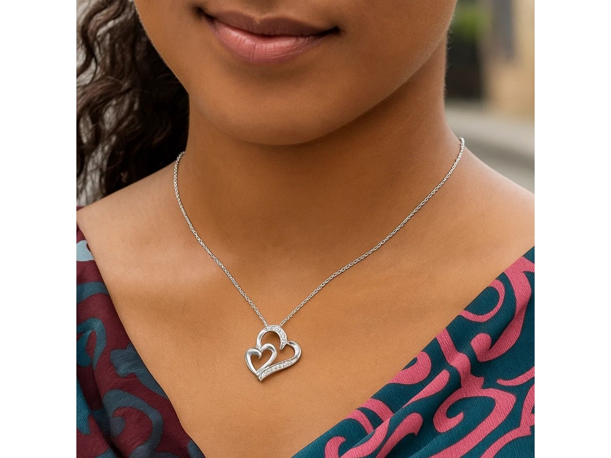 This sterling silver pendant features two graceful heart motifs in graduated sizes. Comes with lovely diamond accents.