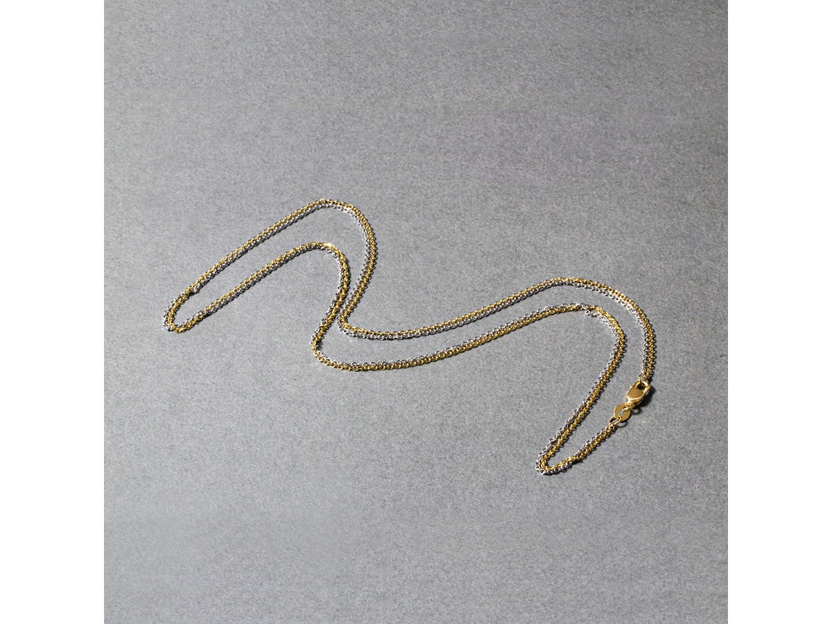 Dual strand cable pendant chain crafted in 14k two tone gold measuring 1.1 millimeters in width for each strand. Secured with a lobster clasp. Available in 18 inches.