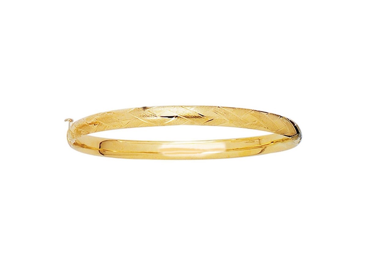 Weave like diamond cuts highlight the beauty of this Childrens bangle. Crafted in 14k yellow gold and measures 5 1/2 inches.