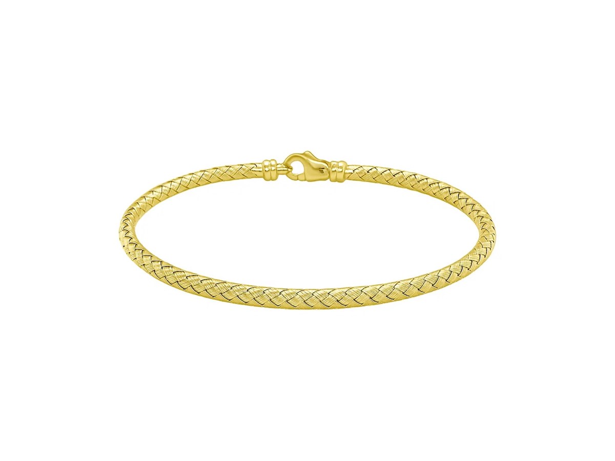 Crafted in 14k yellow gold, this bangle features a weave design and measures 3.0 millimeters in width. Secured with a lobster clasp.