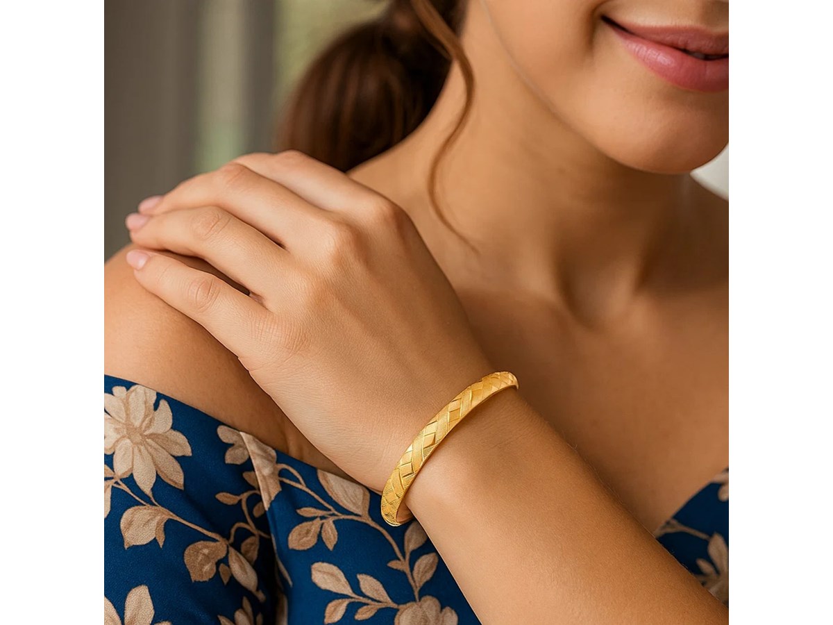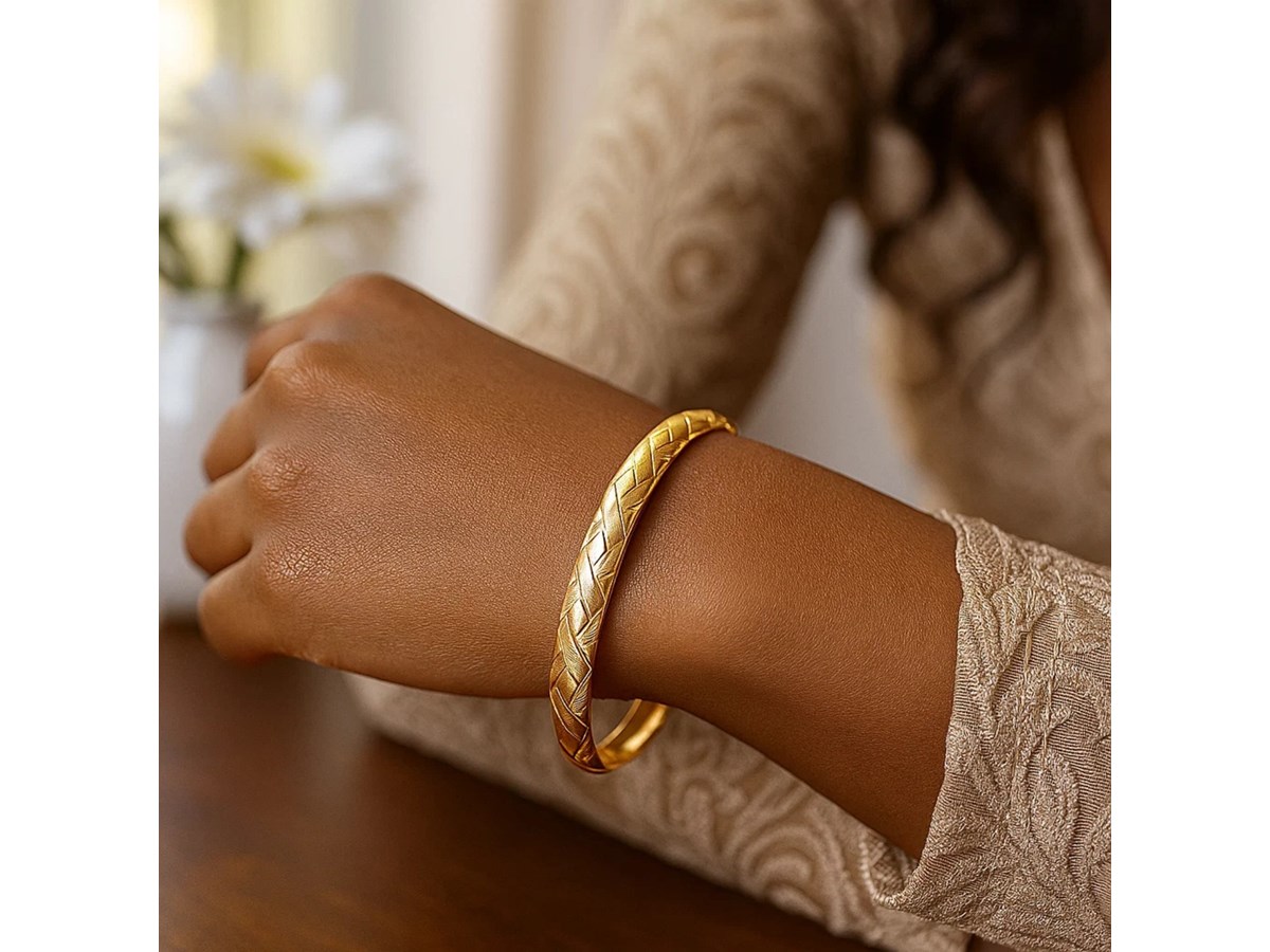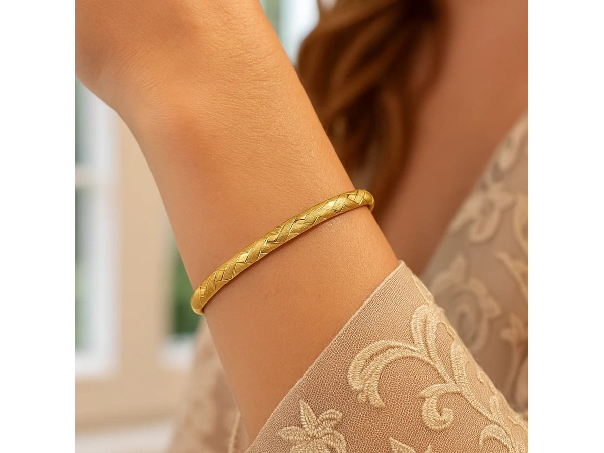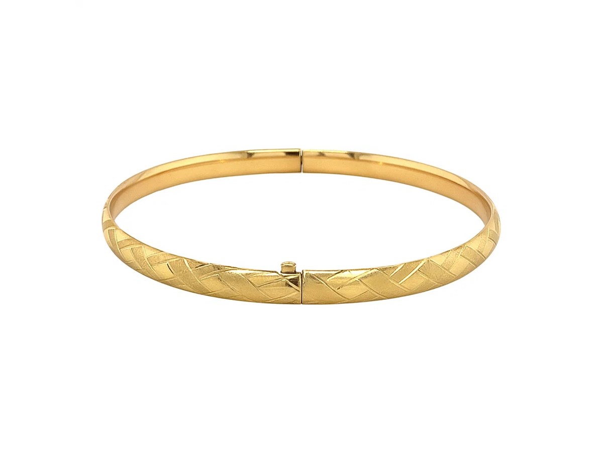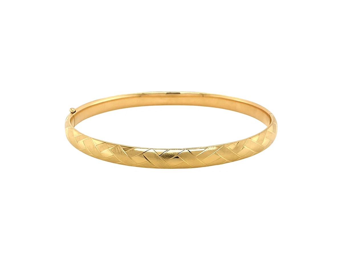 Featuring an exquisite textured woven design, this domed bangle is crafted in fine 14k yellow gold. Comes with a side clasp and available in size 7 inches and 8 inches.