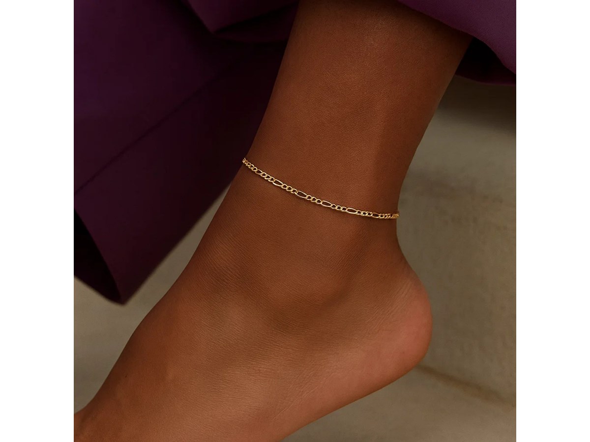 Figaro anklet crafted in 14k yellow gold measuring 1.9 millimeters in width and featuring a spring ring closure.
